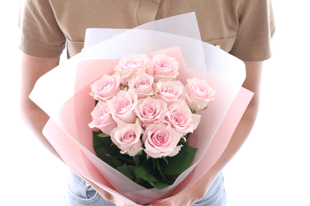 プロポーズのピンク色バラの花束(12本) 12本のバラの花言葉は「私の妻になってください」。優しい色のバラで伝えるプロポーズにおすすめです。 ¥7,200