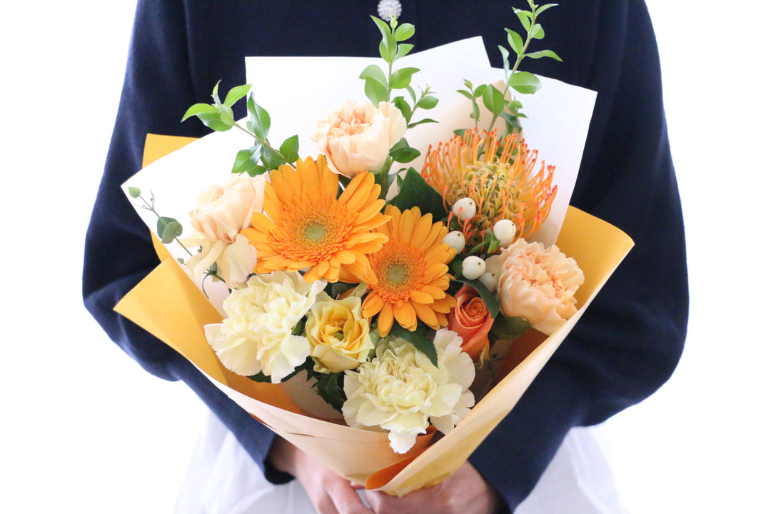 A. 男性には落ち着きのある黄色ベースの花束やアレンジメントがおすすめです。グリーンを取り入れると上品で贈りやすい花束になります。