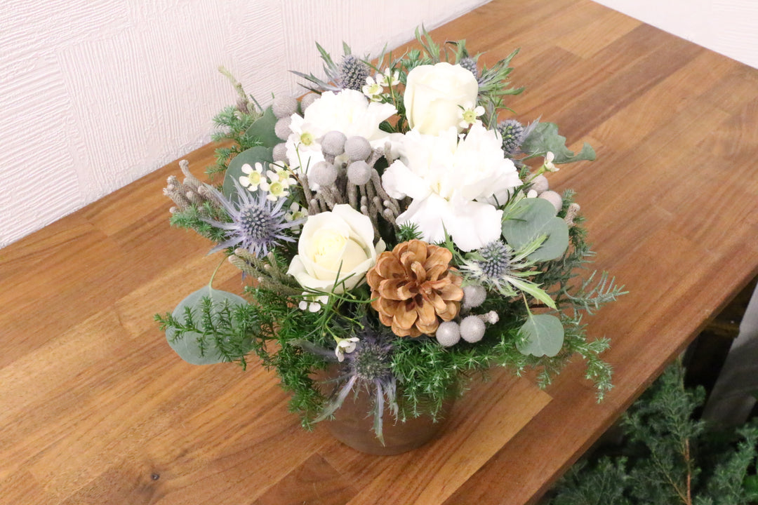 上品に輝く、純白のバラのクリスマスアレンジメント