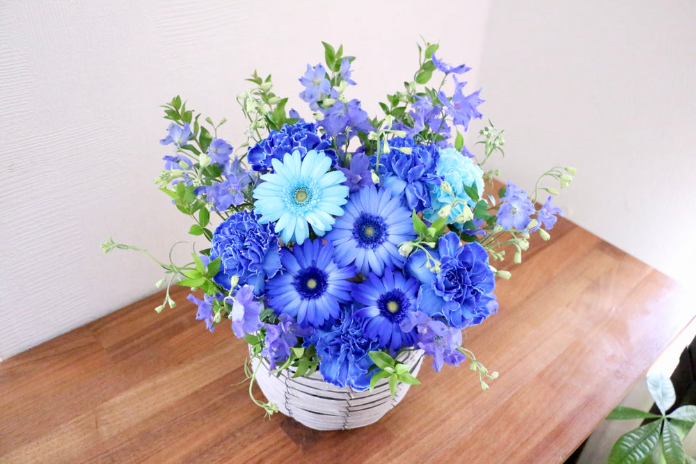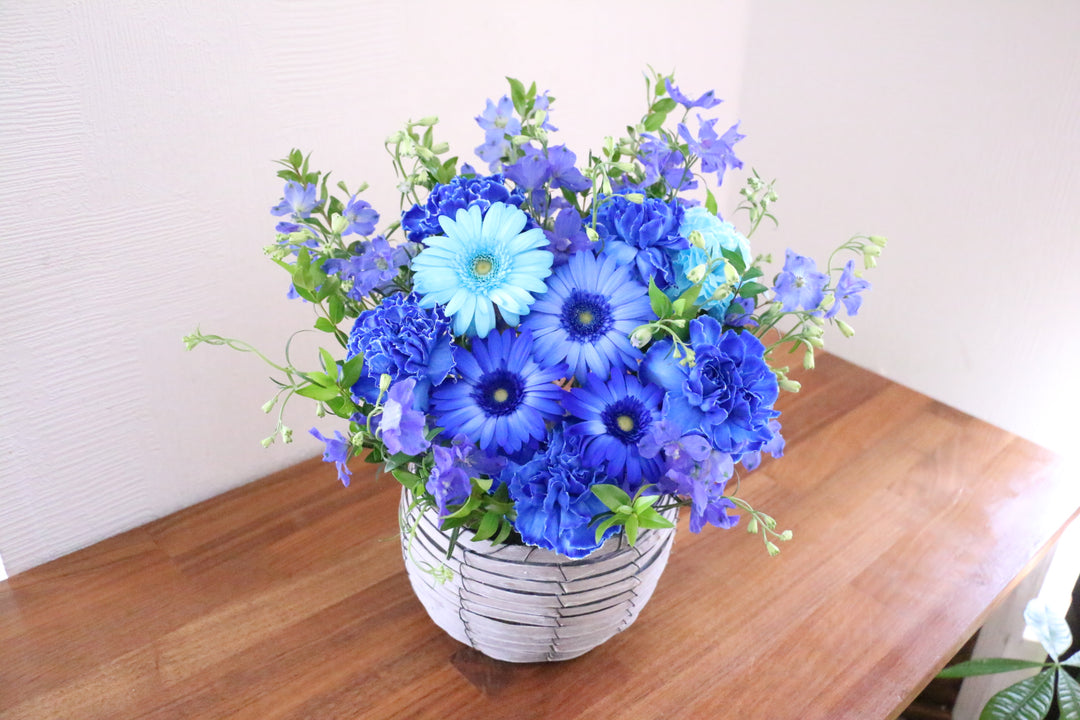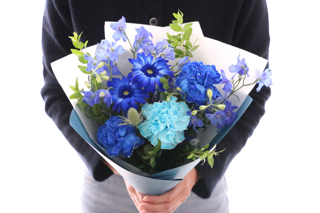 スタイリッシュで個性が光る青系の花束は、ありきたりではない特別感を演出できます。男性向けギフト、誕生日、送別などあらゆる場面でお選びいただけます。