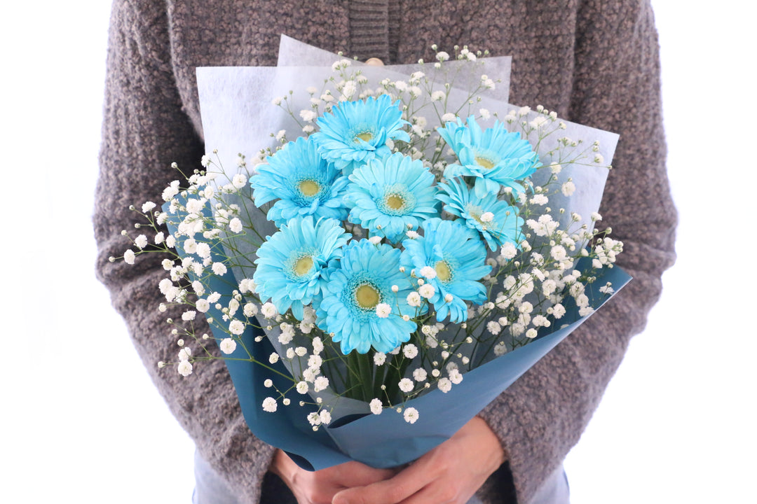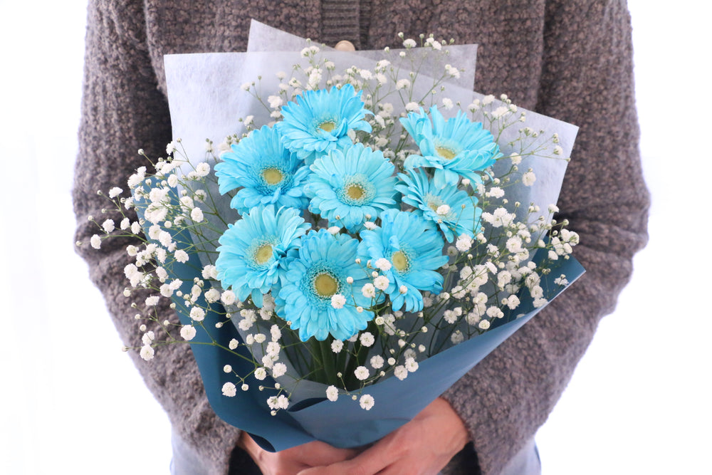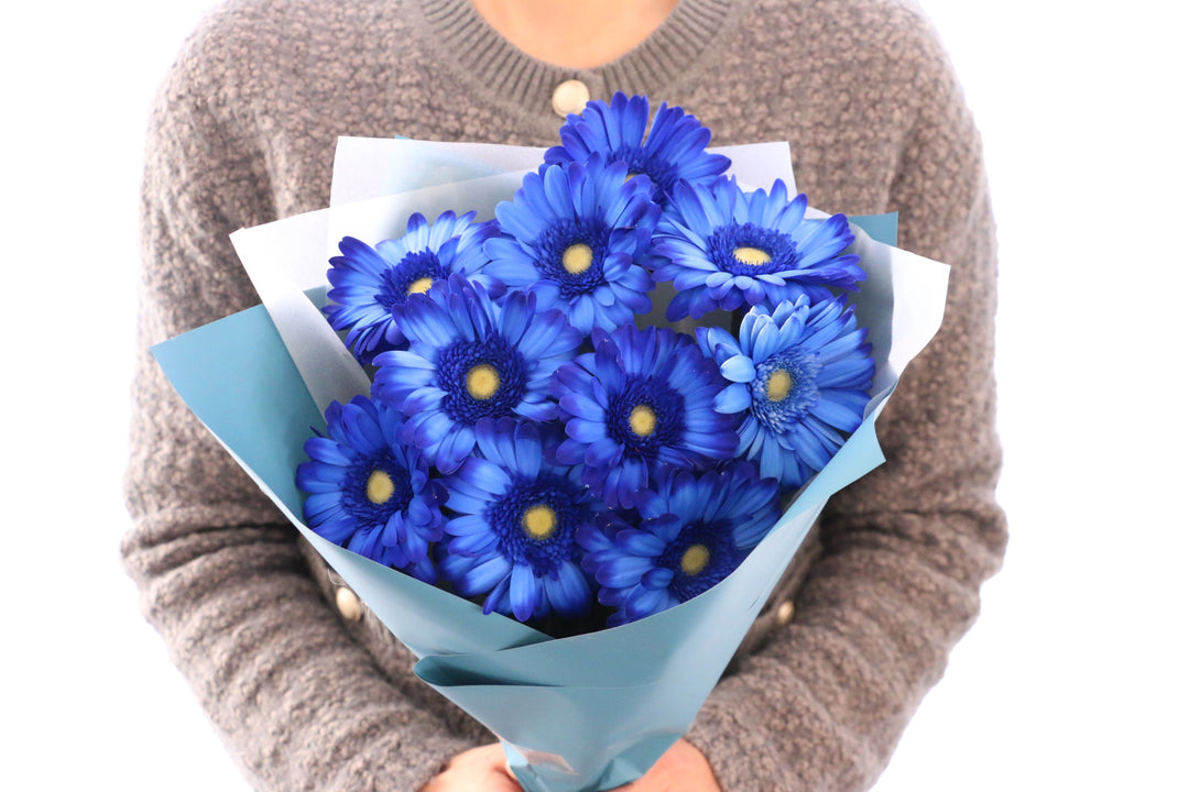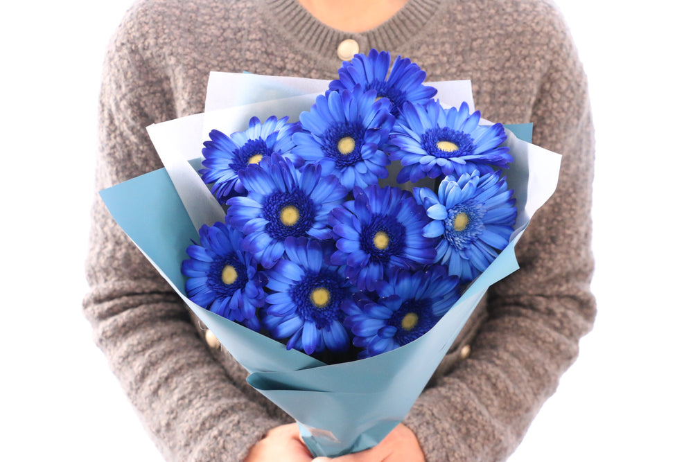 A. 青いガーベラは「神秘」「冷静」を意味します。珍しいため特別感があり、印象的なギフトになります。