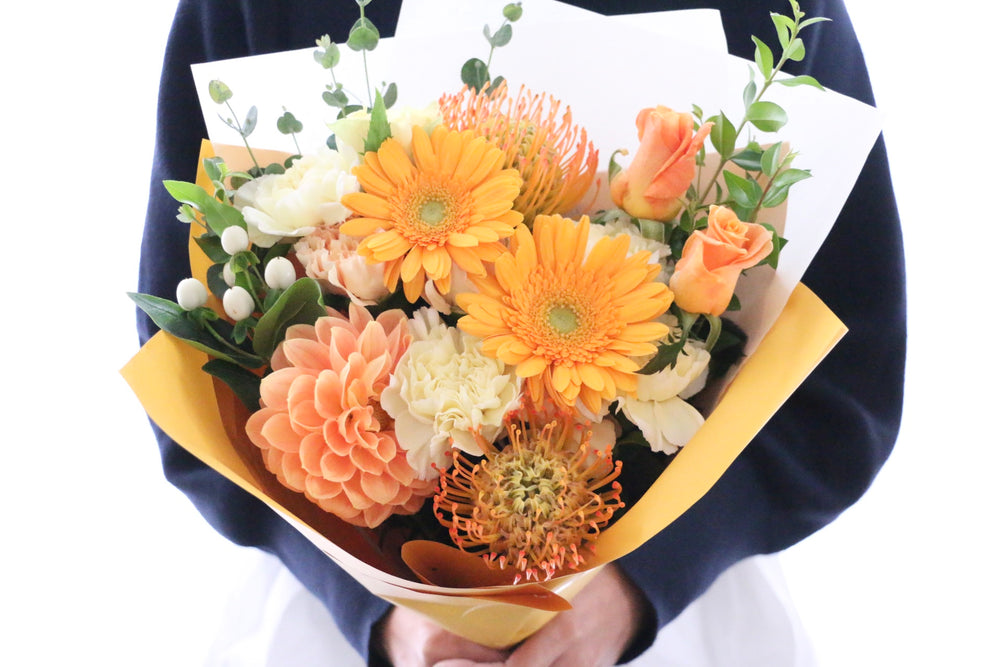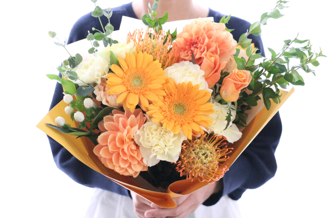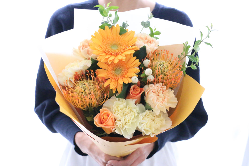 男性へのフラワーギフトとして選ばれやすい色味は元気の出るオレンジ系や落ち着いたブルー系の花束です。