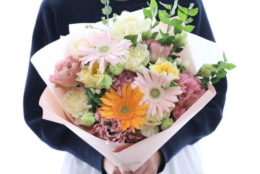 お祝い用途では【ピンク】【黄色・オレンジ】【赤】【紫】【水色・青】【白・グリーン】の6色をベースとした花束を中心にご用意しておりますので、お相手の雰囲気に合わせてお選びください。