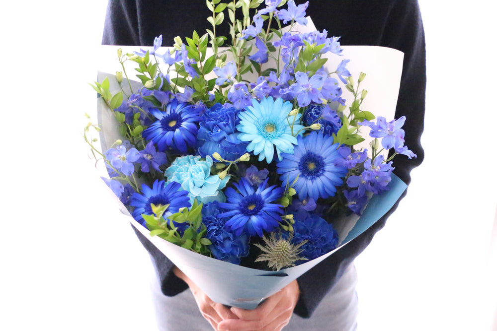 <商品の特徴> 青色のお花をベースに清楚で爽やかな雰囲気で仕上げた花束です...