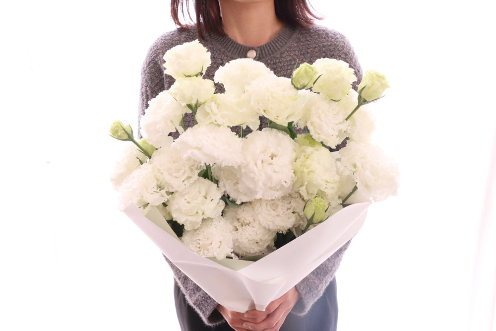 <商品の特徴> 白色のお花をベースに洗練された爽やかな雰囲気で仕上げた花束...