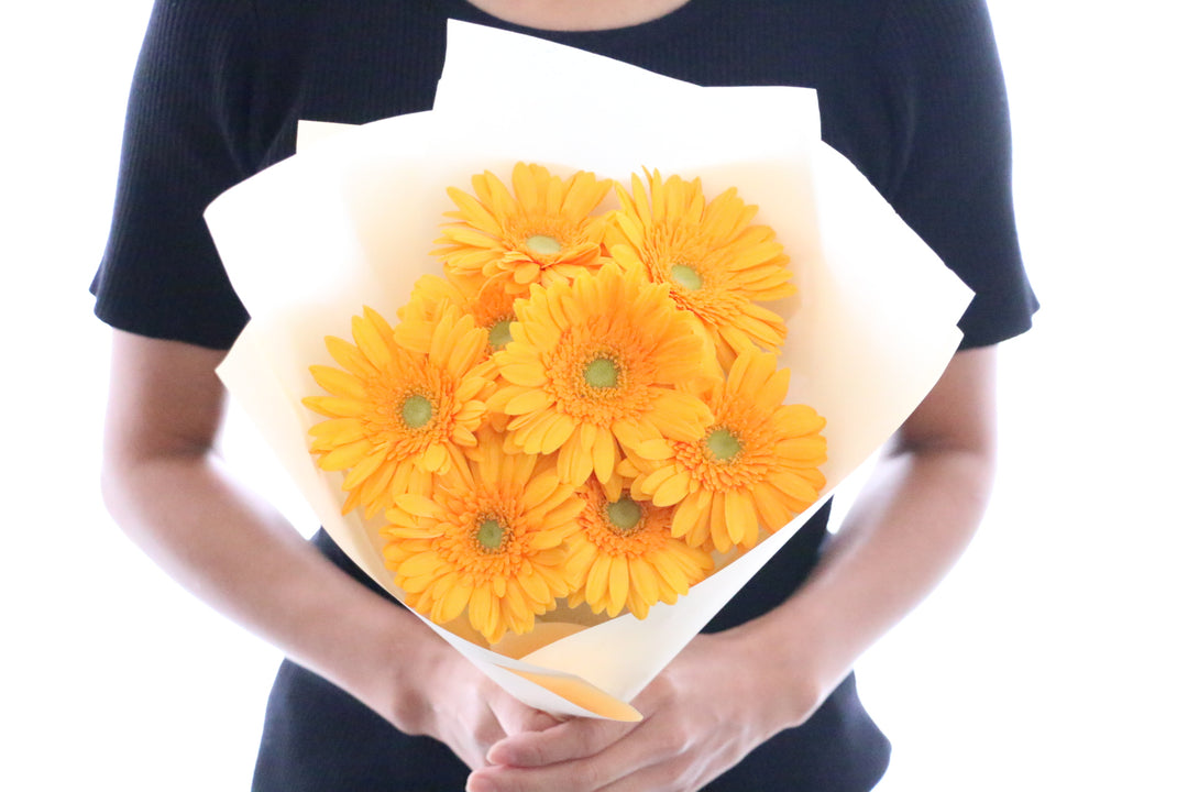A. オレンジのガーベラ花束は「冒険心」「元気」という前向きな花言葉を持ちます。明るい印象で、誕生日や送別、卒業など新しいスタートを祝うシーンにぴったりです。