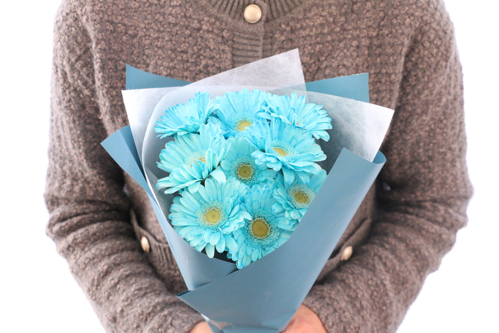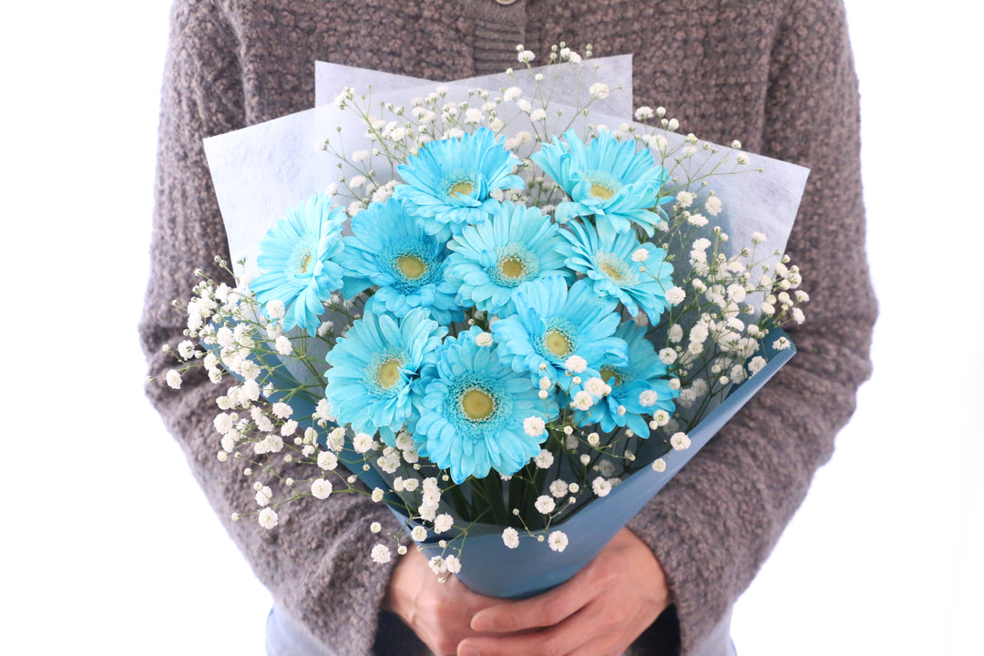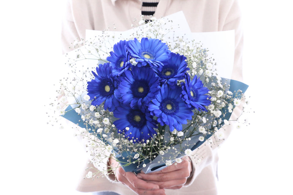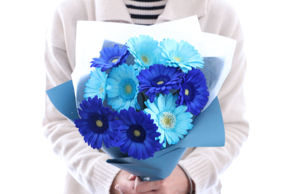 A. 自然界には青いガーベラは存在しませんが、染色した青いガーベラ花束は人気があります。青は「神秘」「冷静」をイメージさせ、男性へのプレゼントにもおすすめです。