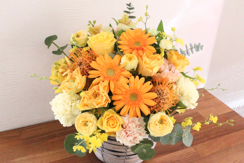 <商品の特徴> 黄色・オレンジ色のお花をベースに明るく元気な雰囲気で仕上げ...
