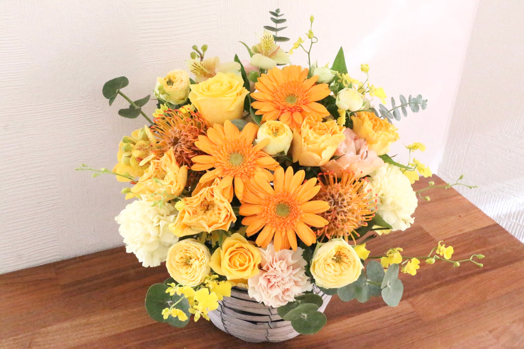 太陽のように明るい印象を与える黄色・オレンジの花束は、カジュアルながらも華やかさ十分。祝福の気持ちをストレートに伝えてくれます。