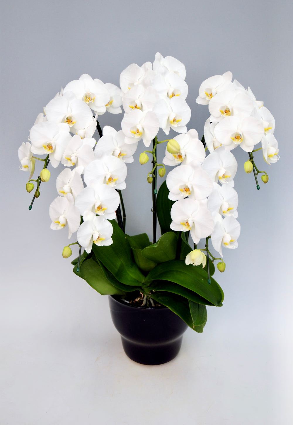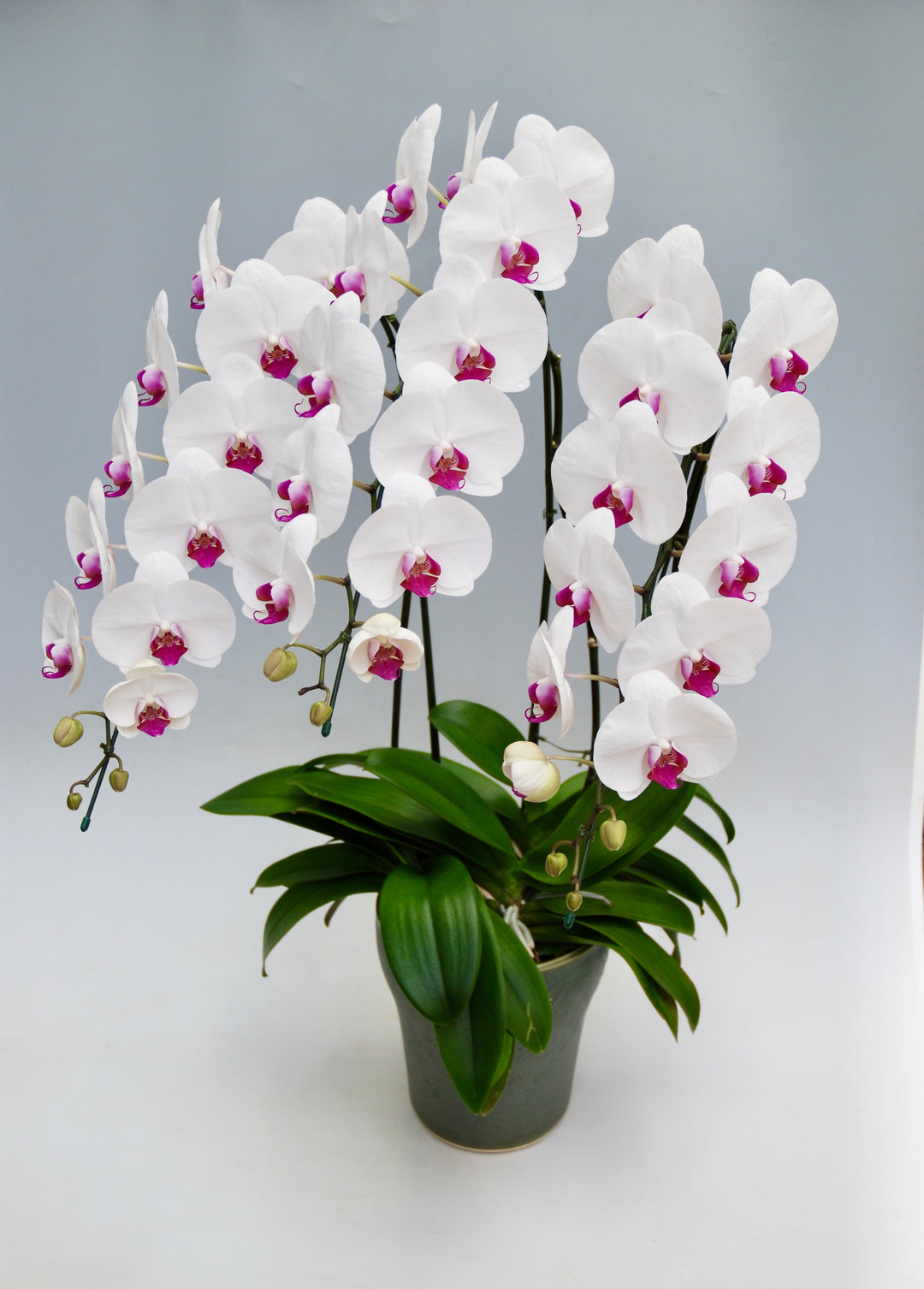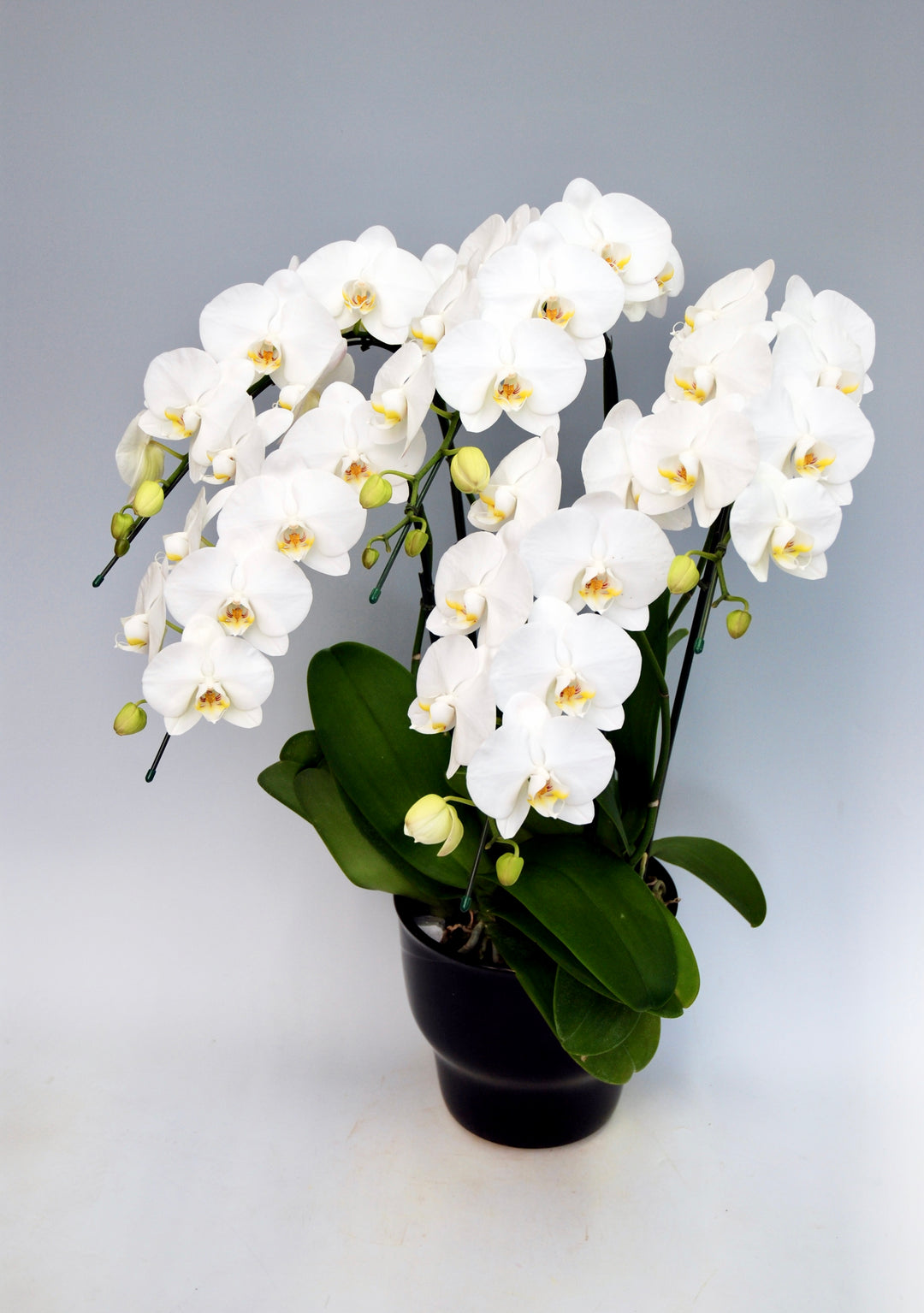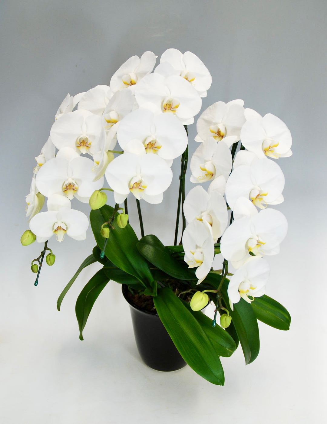 3本立ちで25~32輪前後(蕾含む)の白花タイプの大輪胡蝶蘭です。3本立ち...