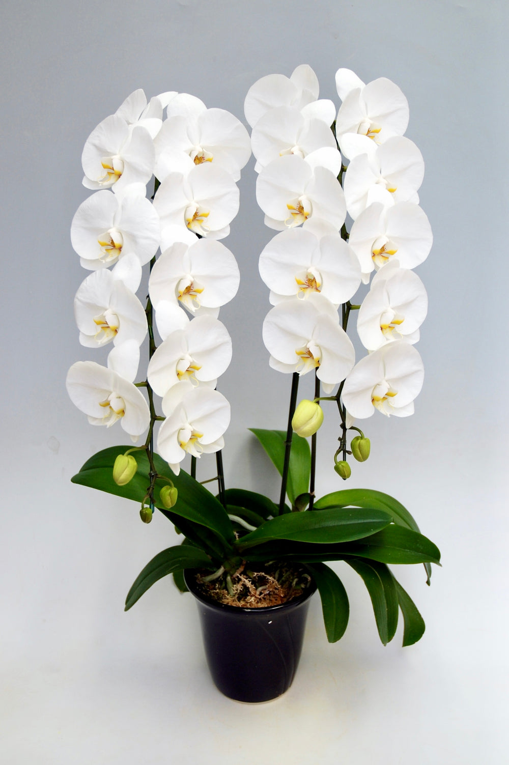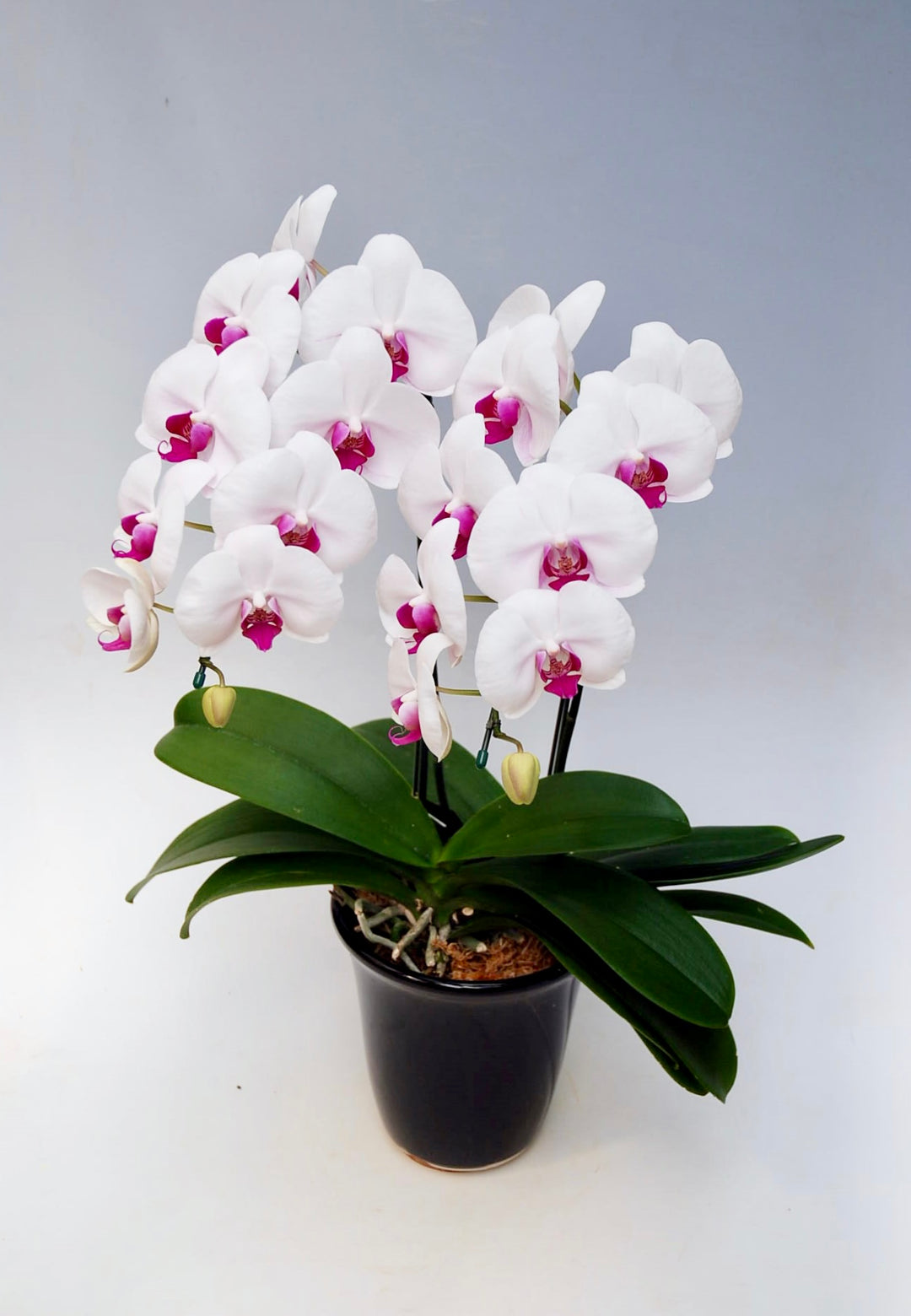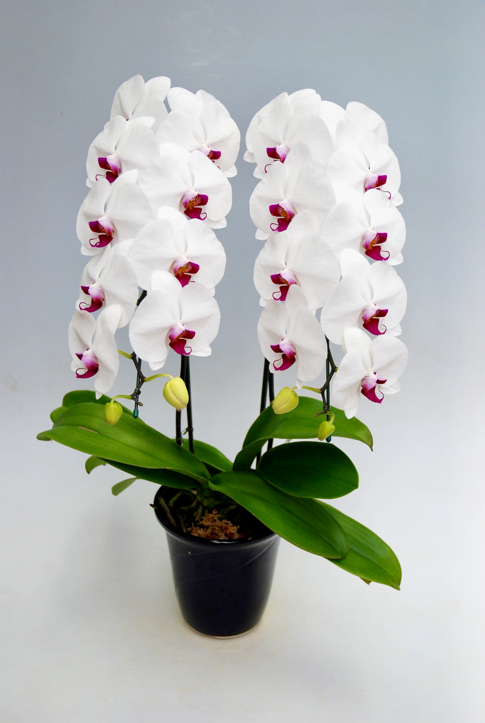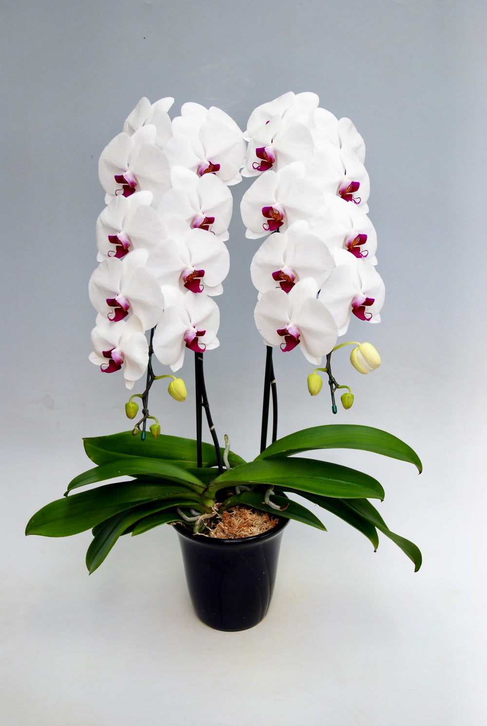 3本立ちで25~32輪前後(蕾含む)の白花タイプの大輪胡蝶蘭です。3本立ち...