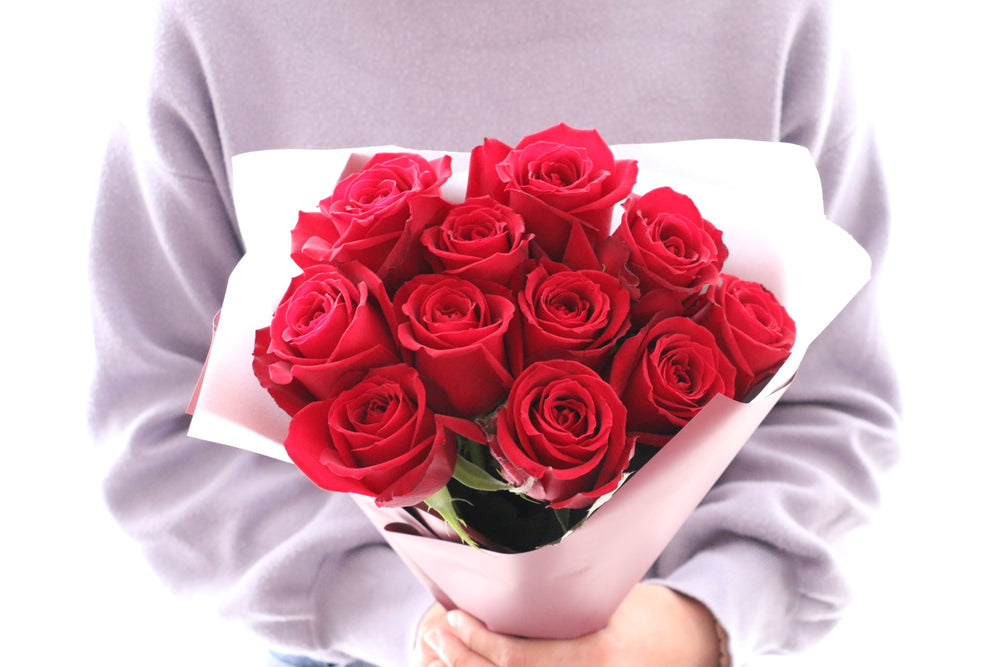 12本の赤いバラとカスミソウ(かすみ草)の花束