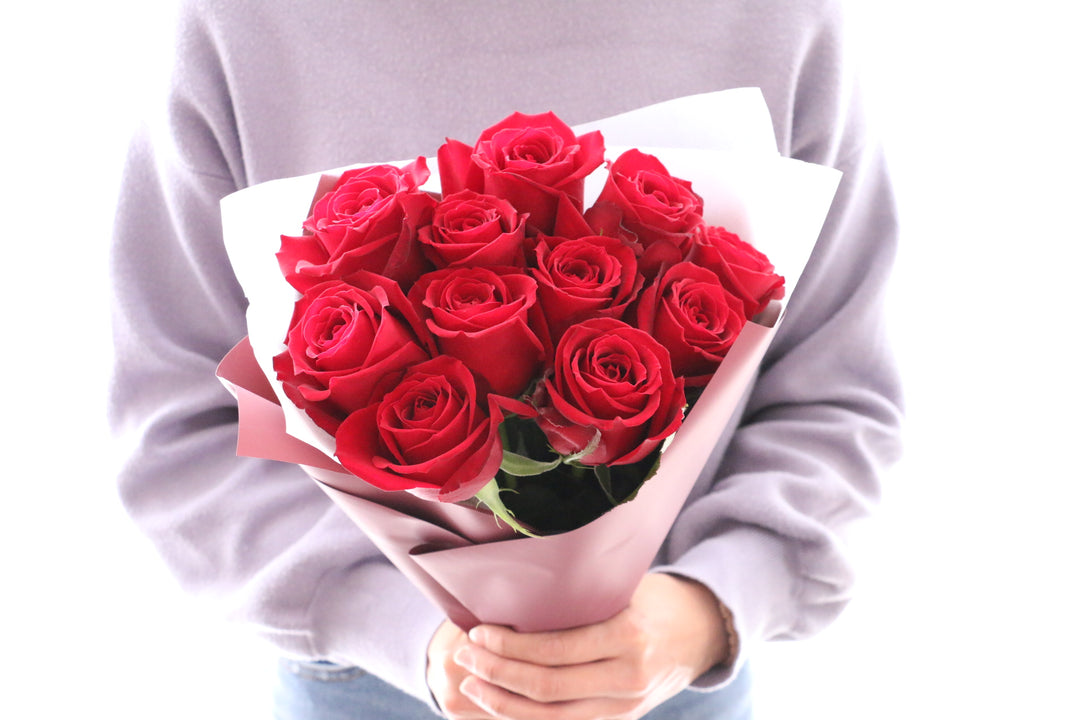 10本の赤いバラとカスミソウ(かすみ草)の花束
