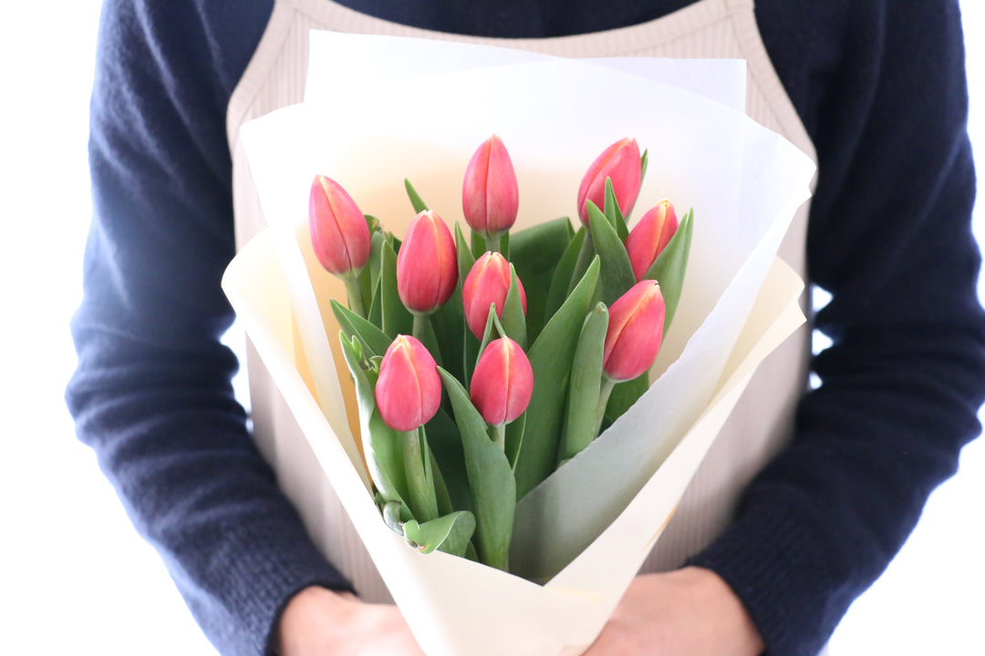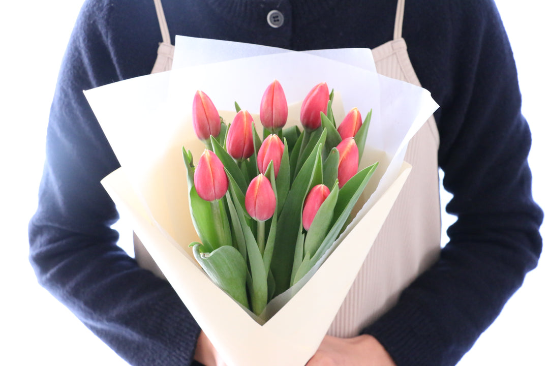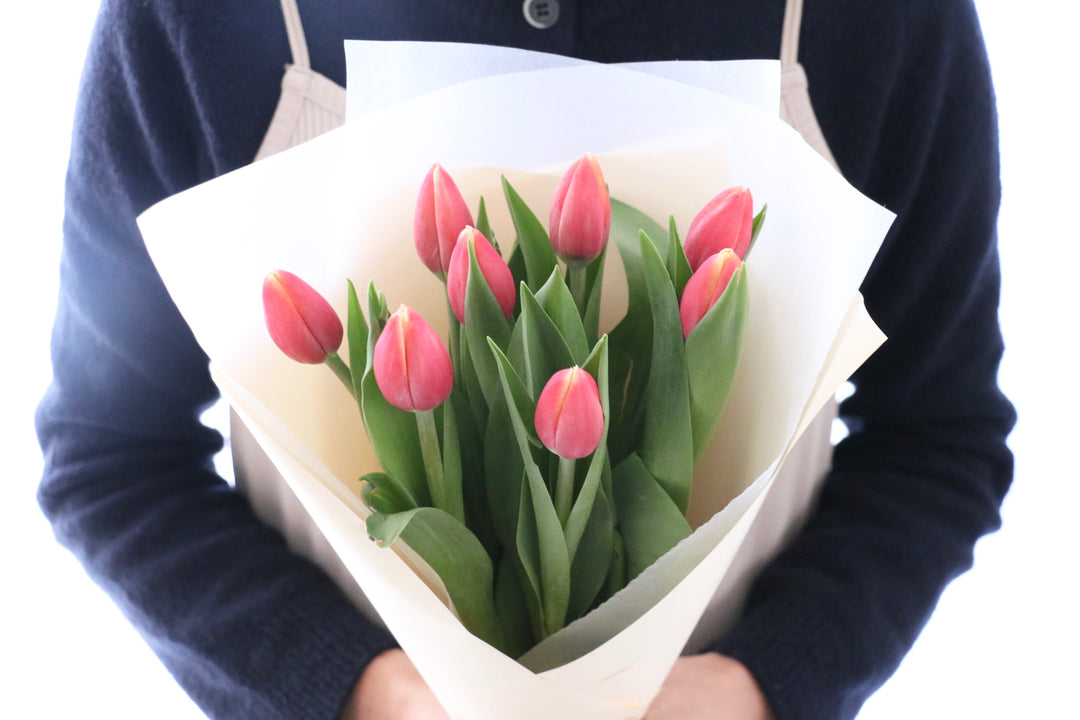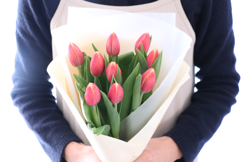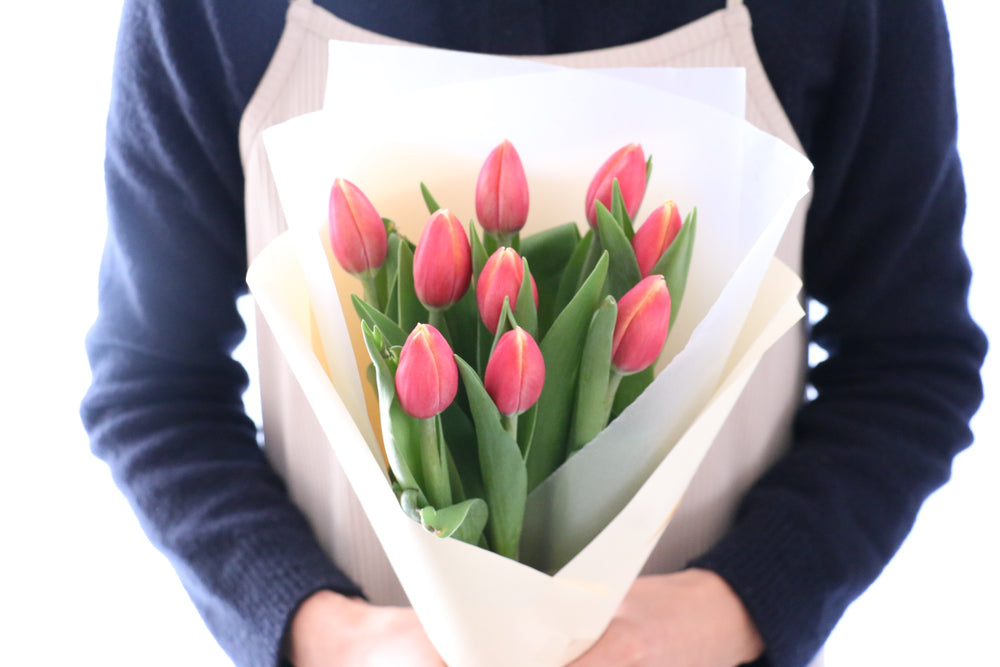 A. どちらも魅力があります。チューリップだけの花束は可憐で洗練された印象に。スイートピーやガーベラなど春の花と合わせると、より華やかで季節感のある雰囲気に仕上がります。
