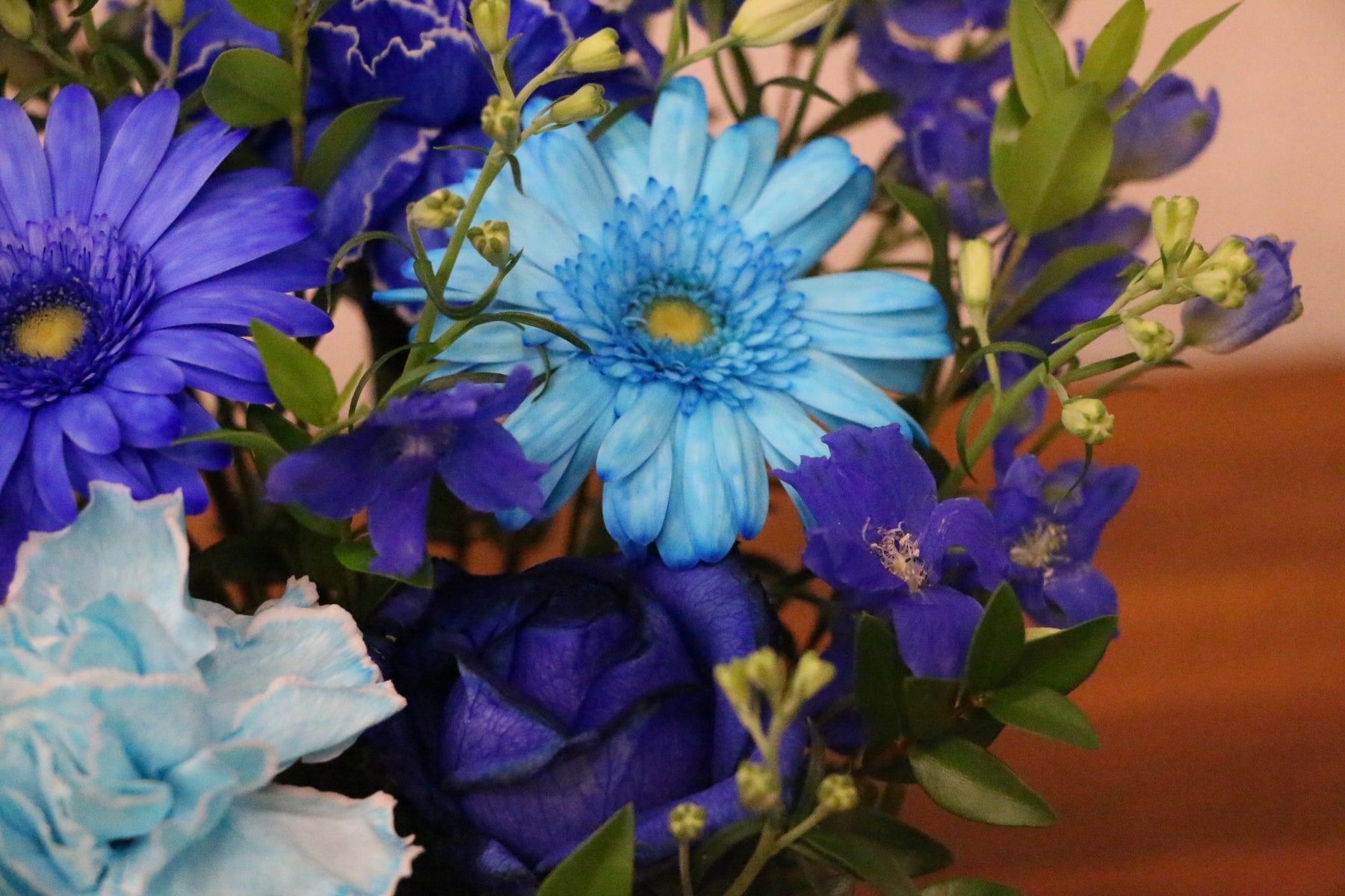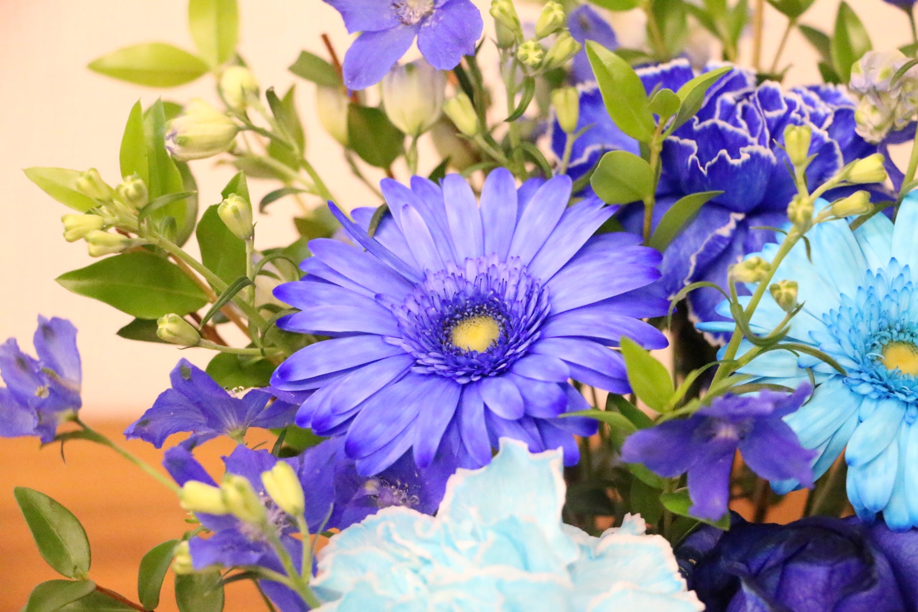 差し色に青色以外の色味(例:緑や紫など)のお花を入れながら、青色でまとめます。