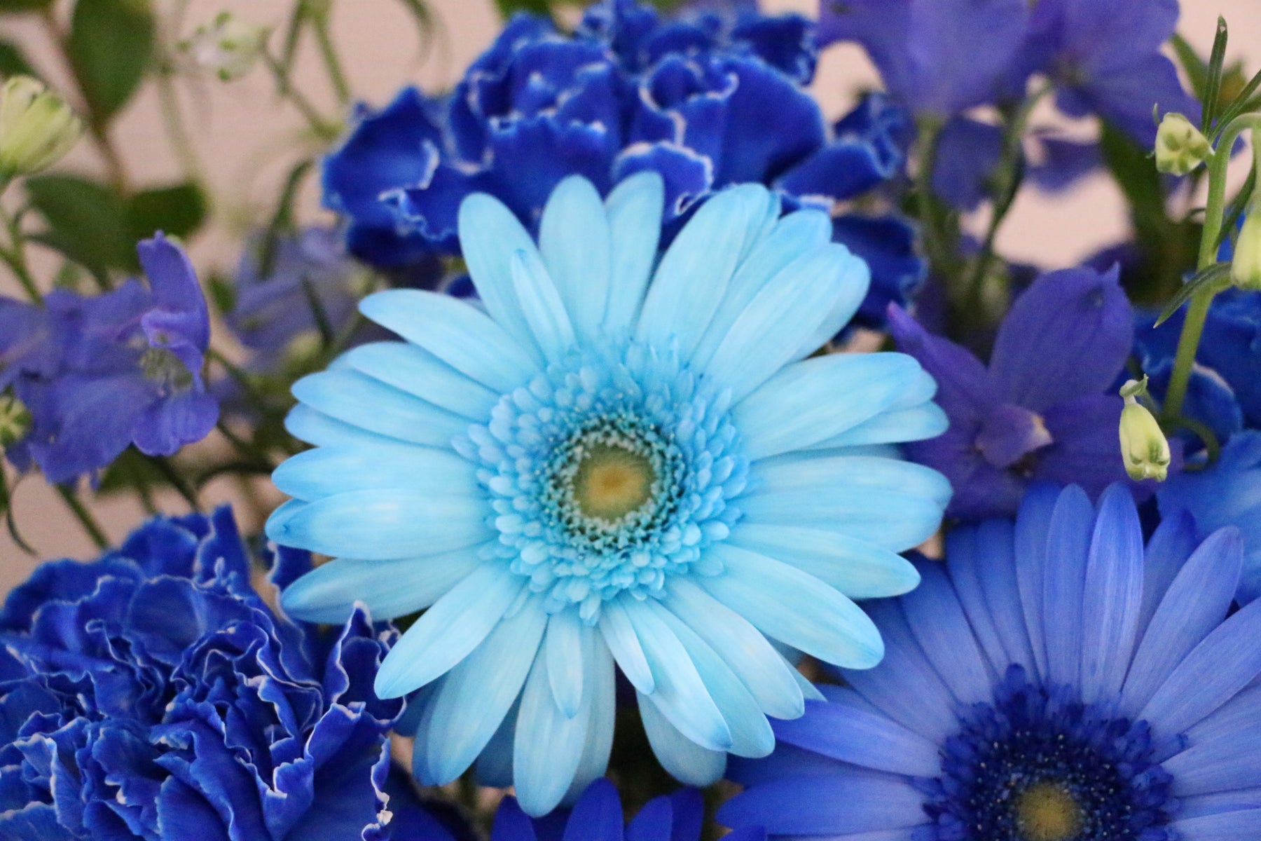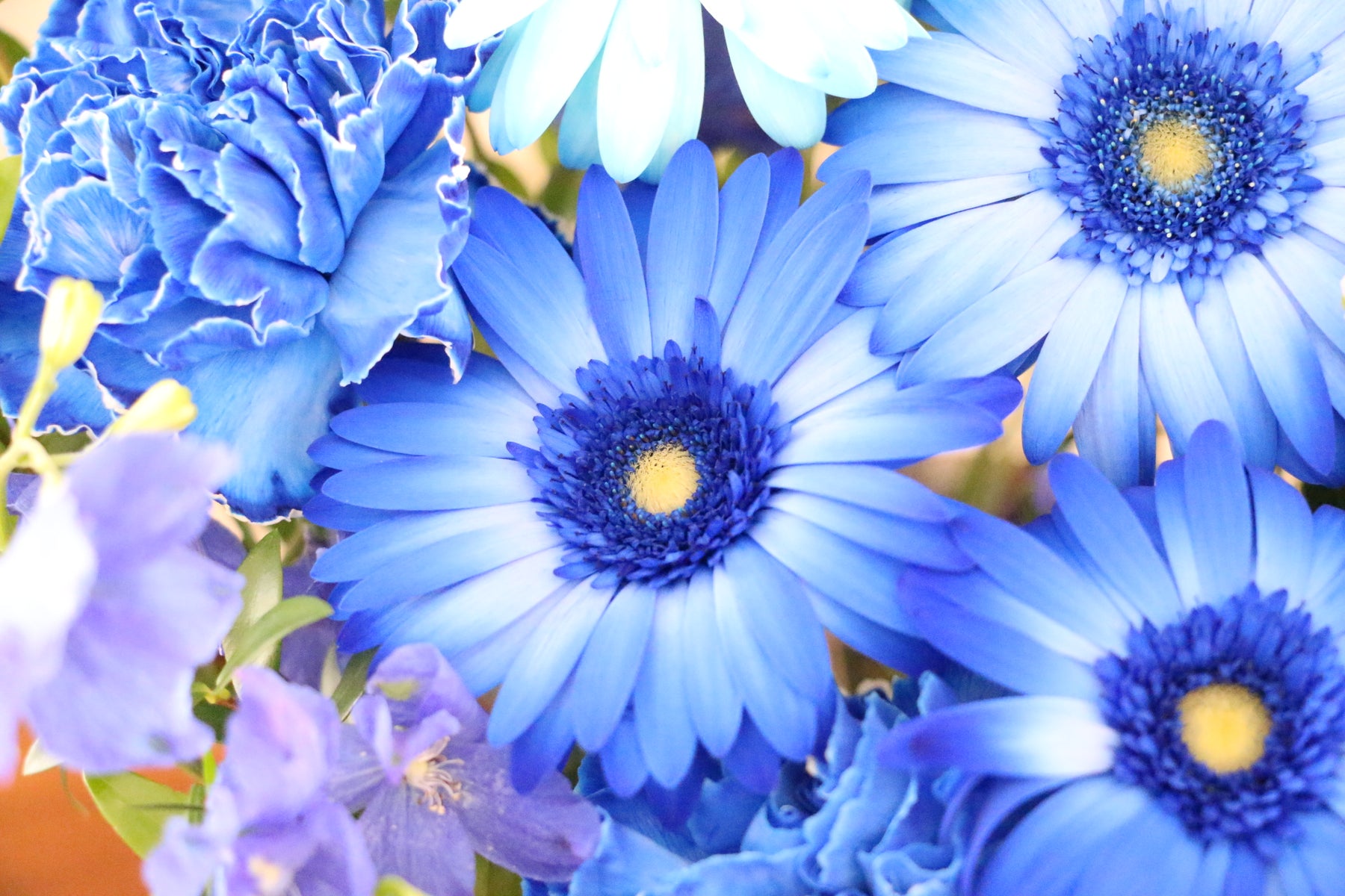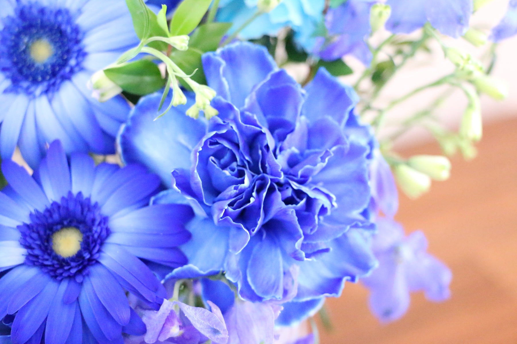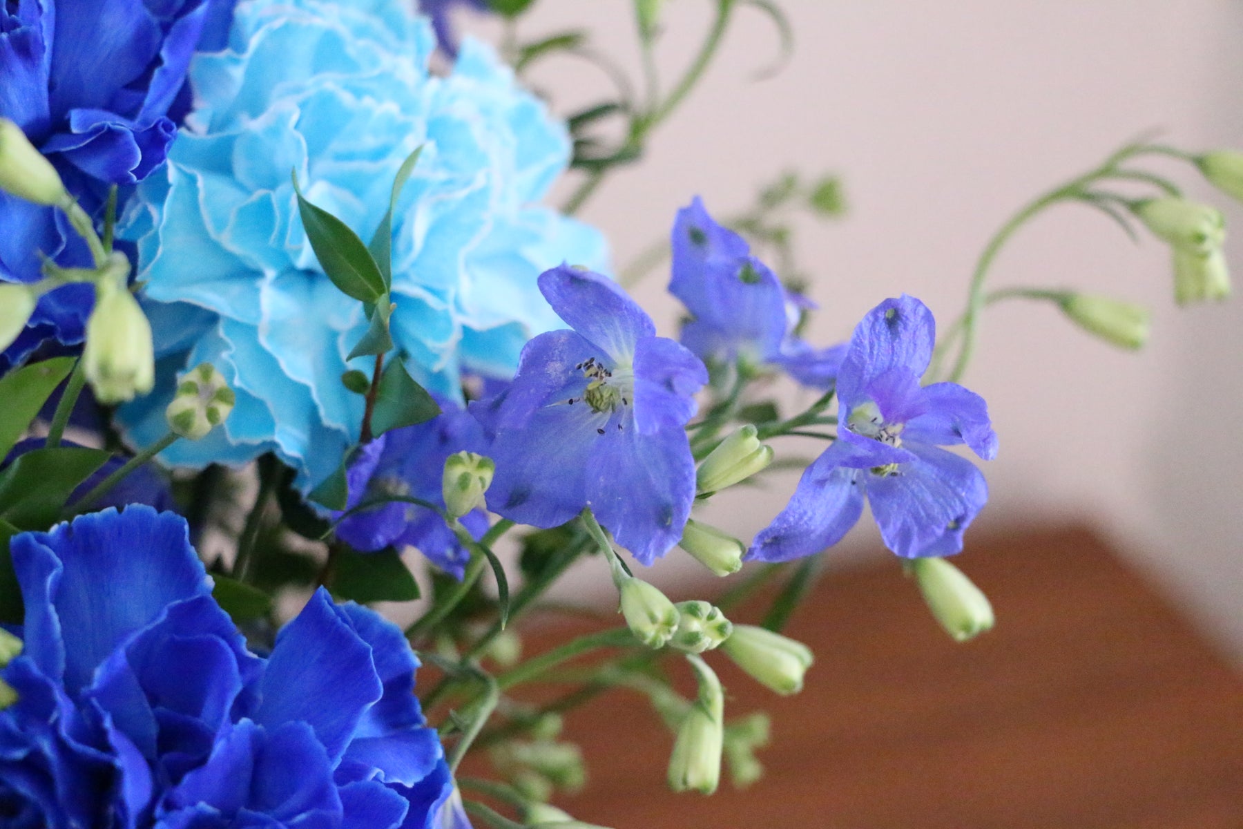 差し色に青色以外の色味(例:緑や紫など)のお花を入れながら、青色でまとめます。