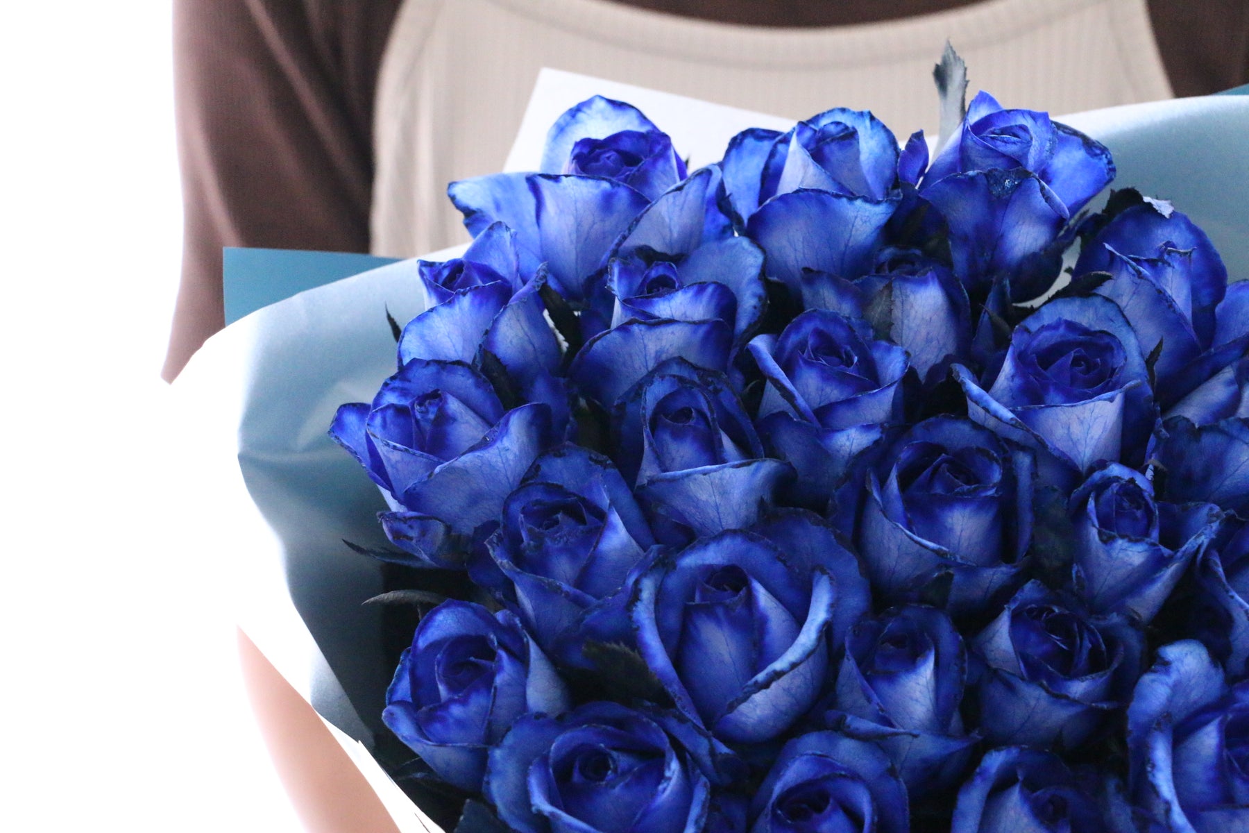 24本の青いバラの花束の花言葉は「1日中あなたを思っています」。青いバラの花束は本数によって花言葉の意味が変わります。