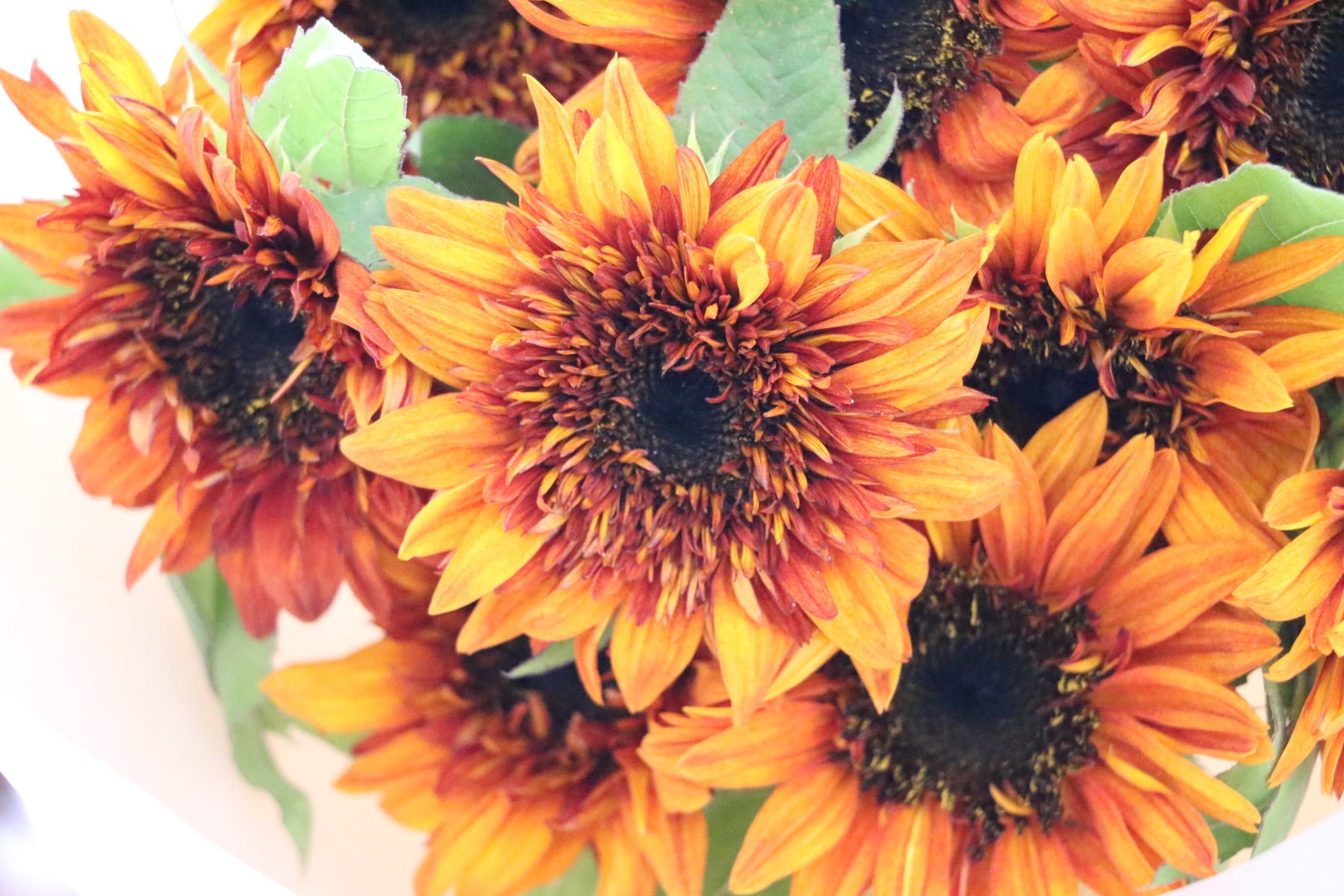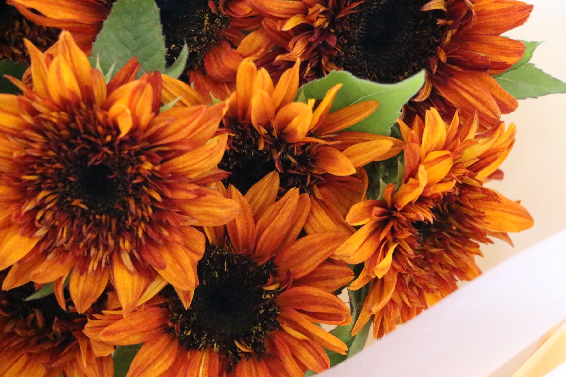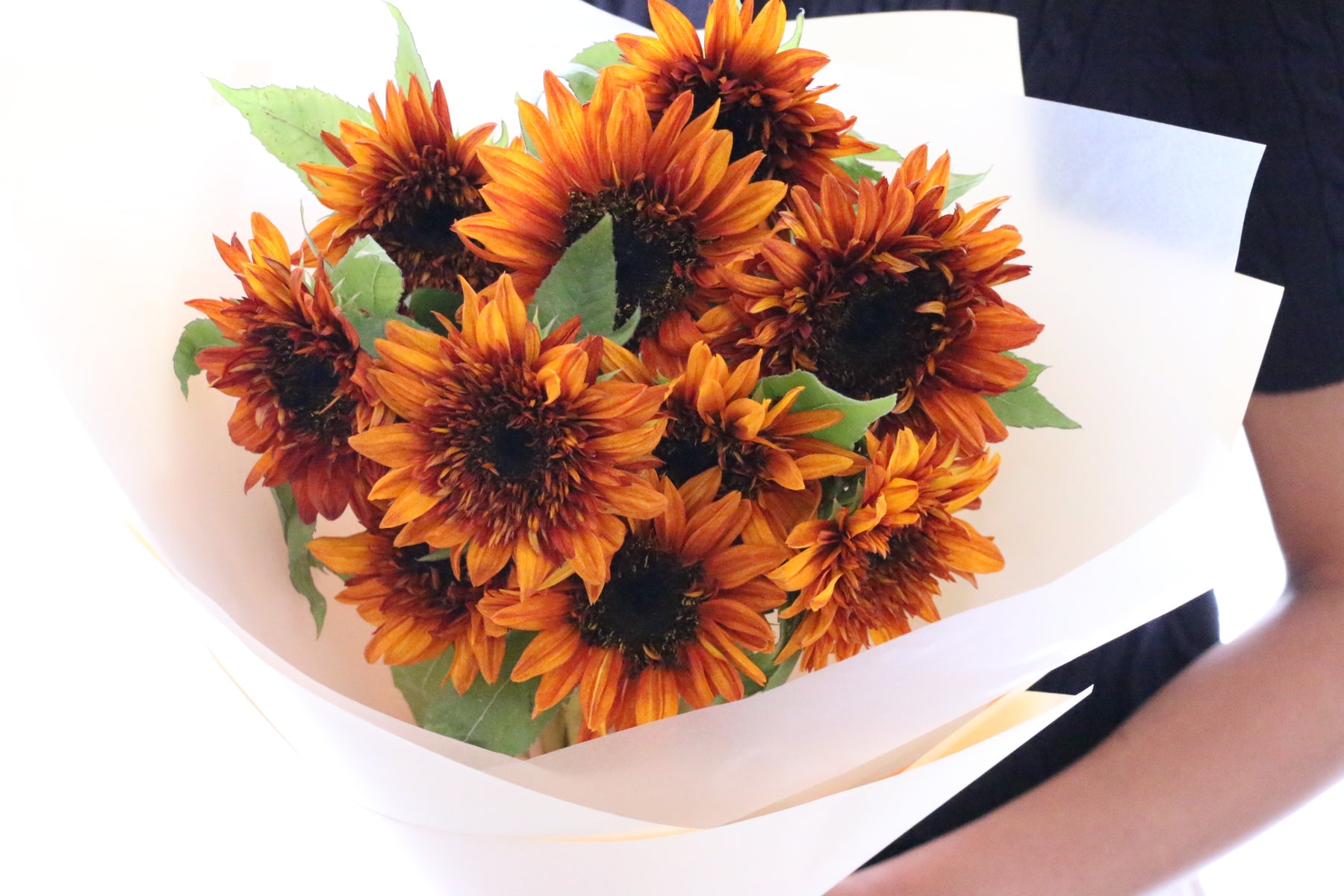 おしゃれな茶色のひまわり10本を束ねたシンプルな花束です。ひまわりは夏を代表するお花ですが、オレンジや黄色のひまわりに飽きた方や、おしゃれな雰囲気の花束をお探しの方におすすめです。お誕生日や退職祝い、ちょっとしたお礼などあらゆる場面でお選びいただけます。