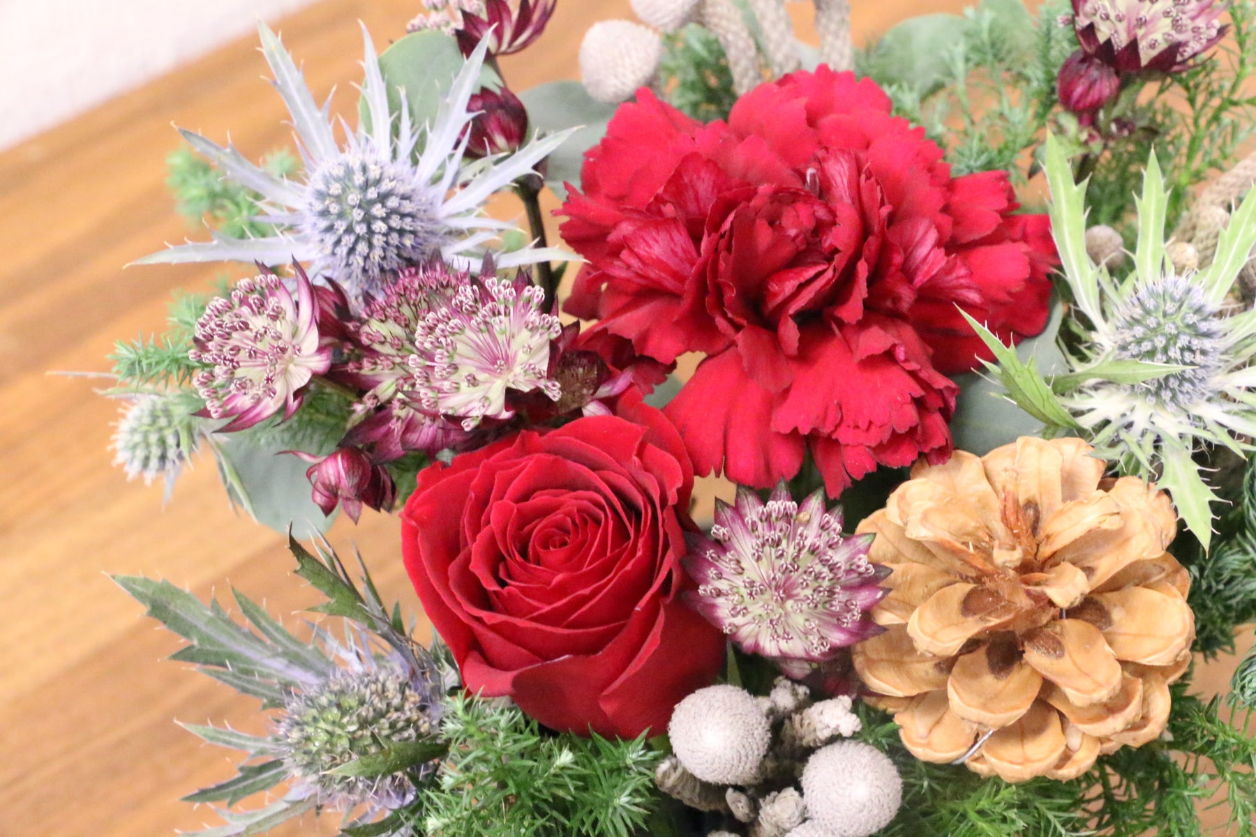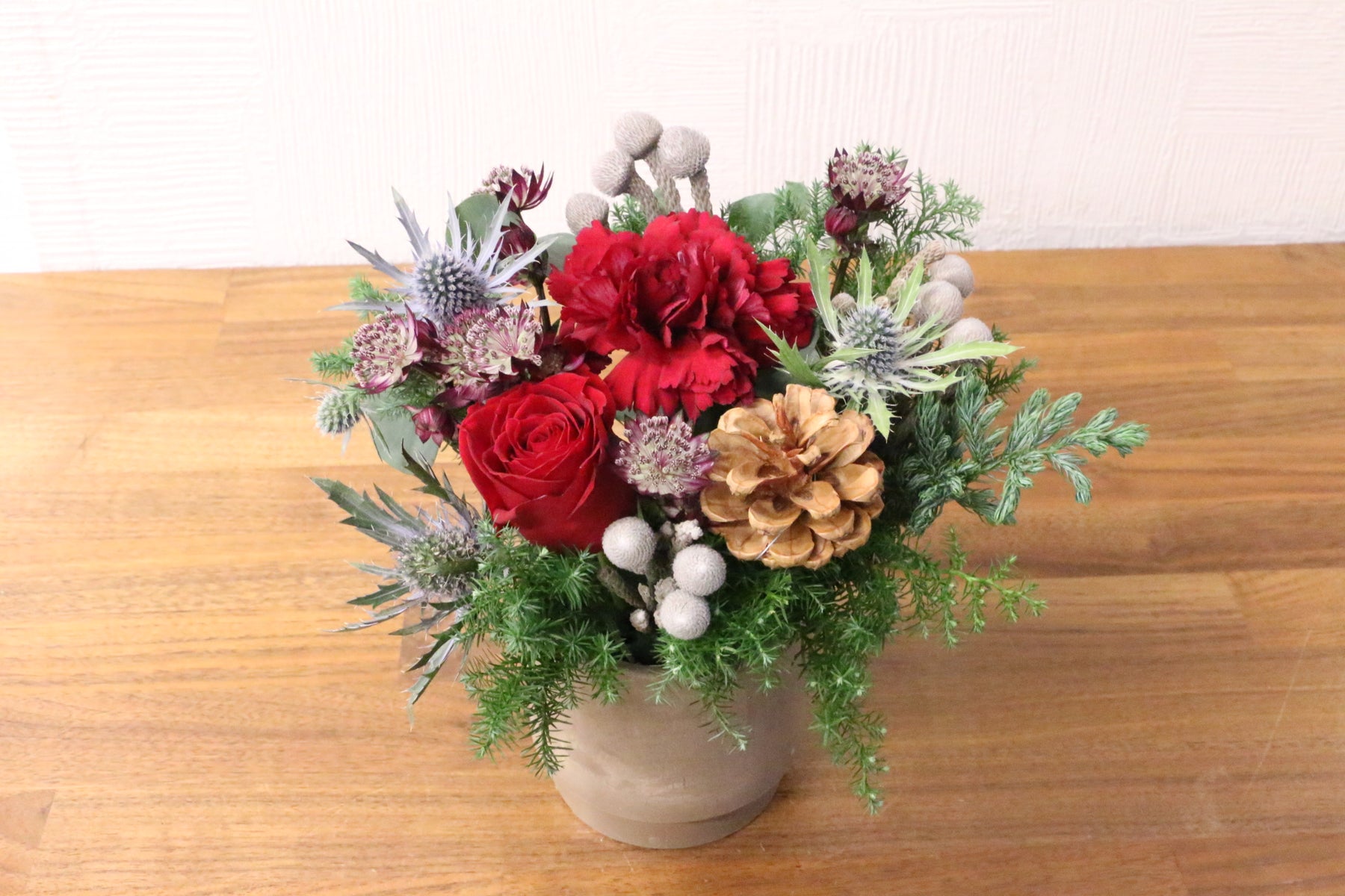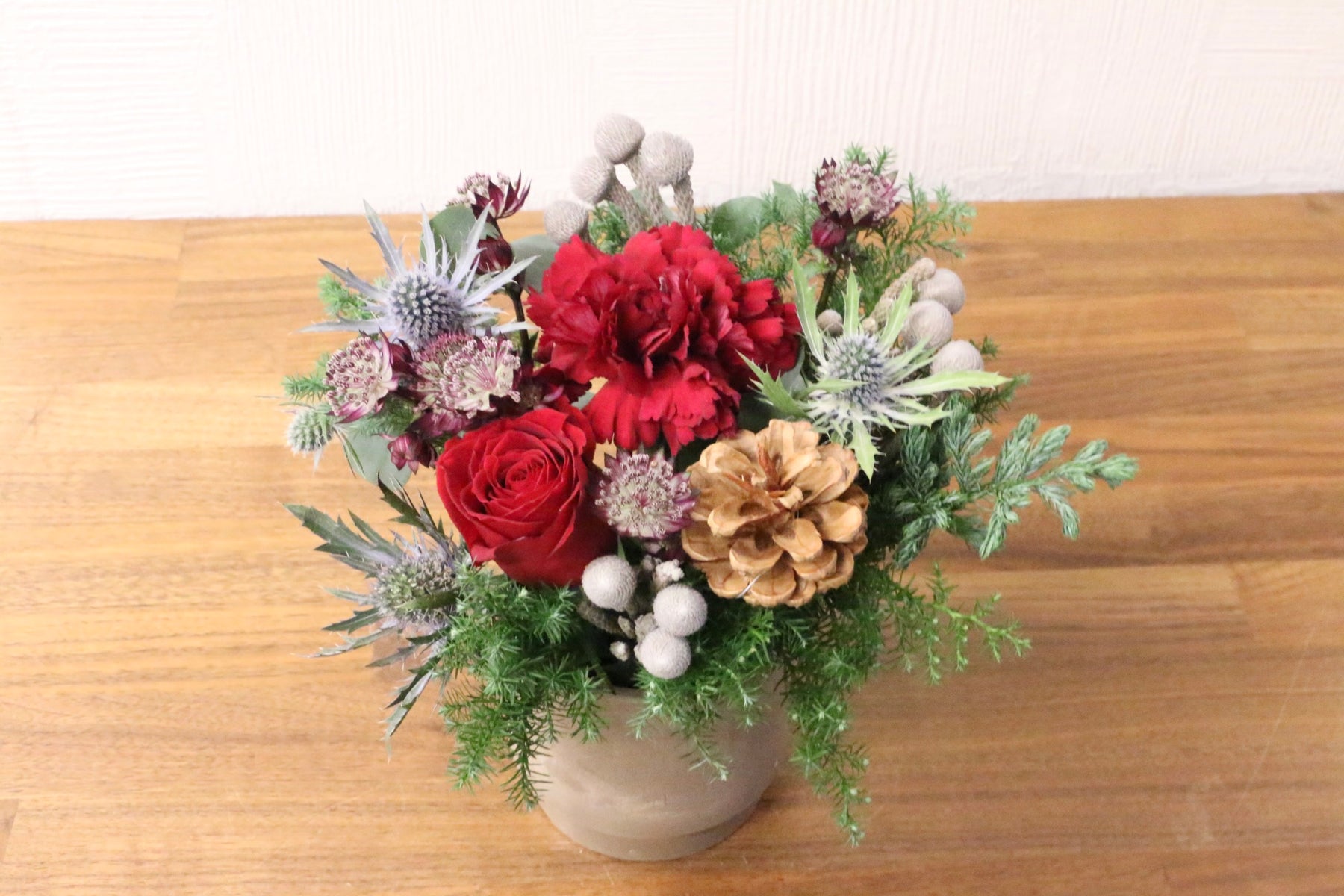 | 花材 | バラ、エレンジューム、ユーカリ、コニファー、松かさ、その他フローリストおまかせ |