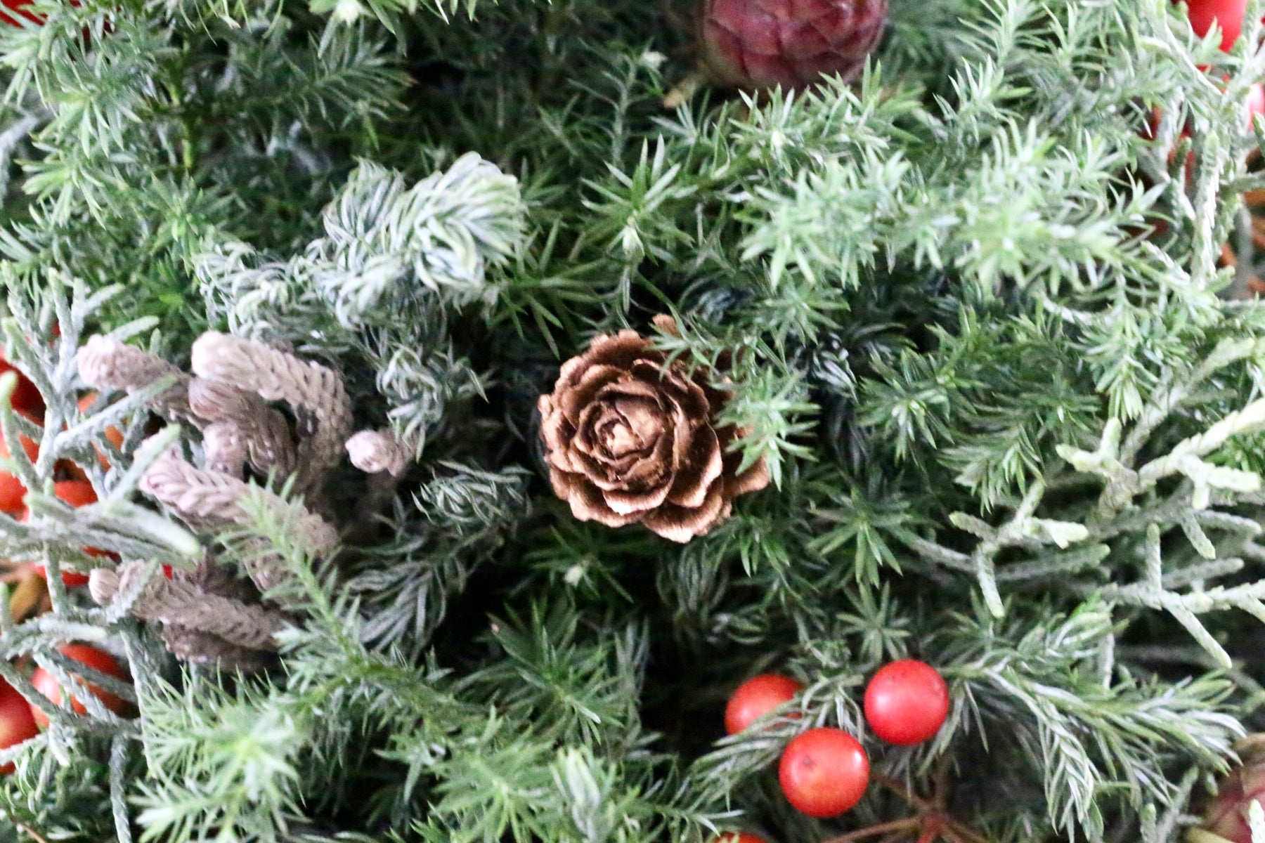 松かさや赤い実をあしらい、ナチュラルで温かみのあるデザインに仕上げます。