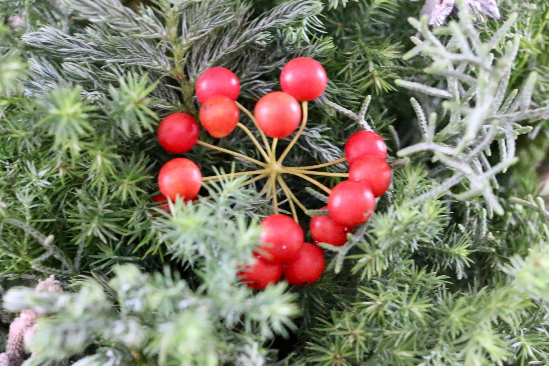 松かさや赤い実をあしらい、ナチュラルで温かみのあるデザインに仕上げます。