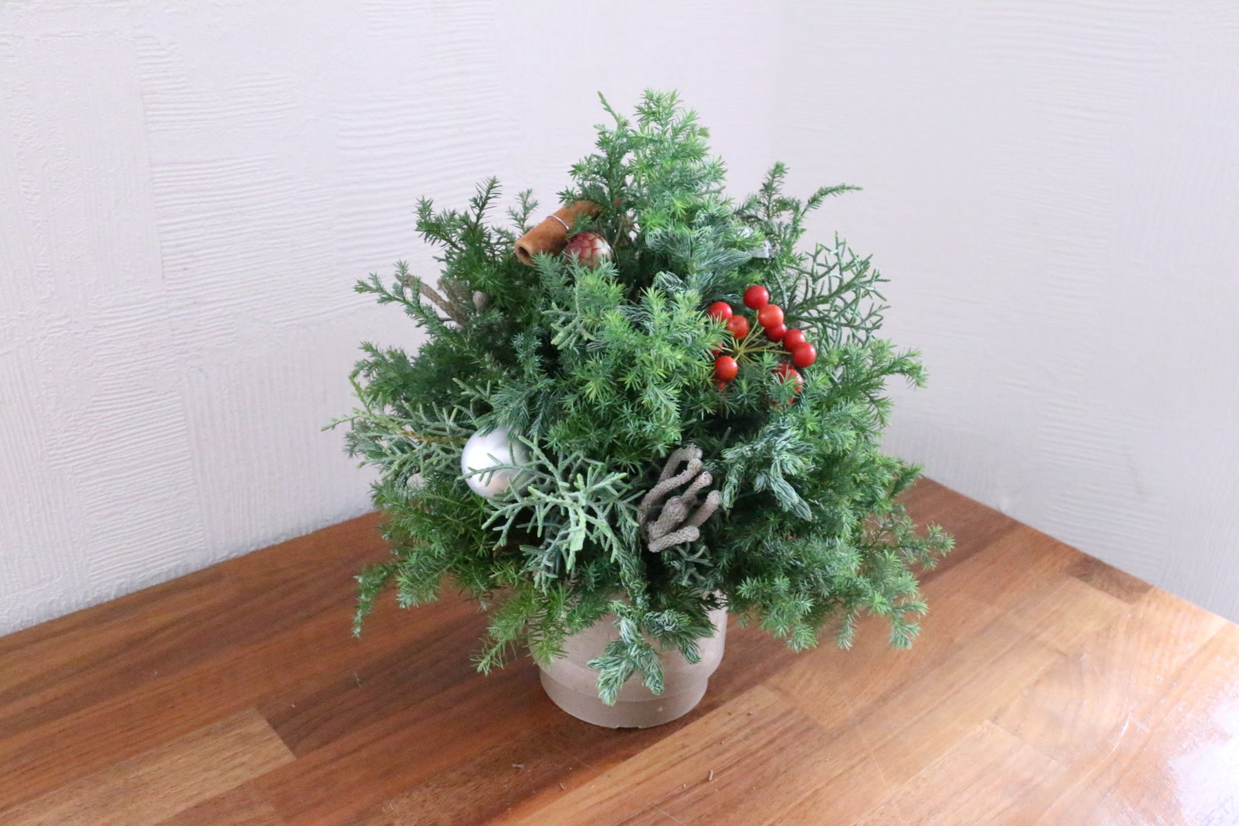 お部屋に飾るだけで、まるで小さなツリーを迎えたような華やかさがあるアレンジメントです。