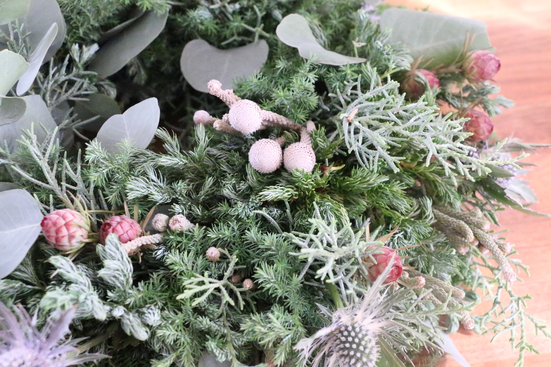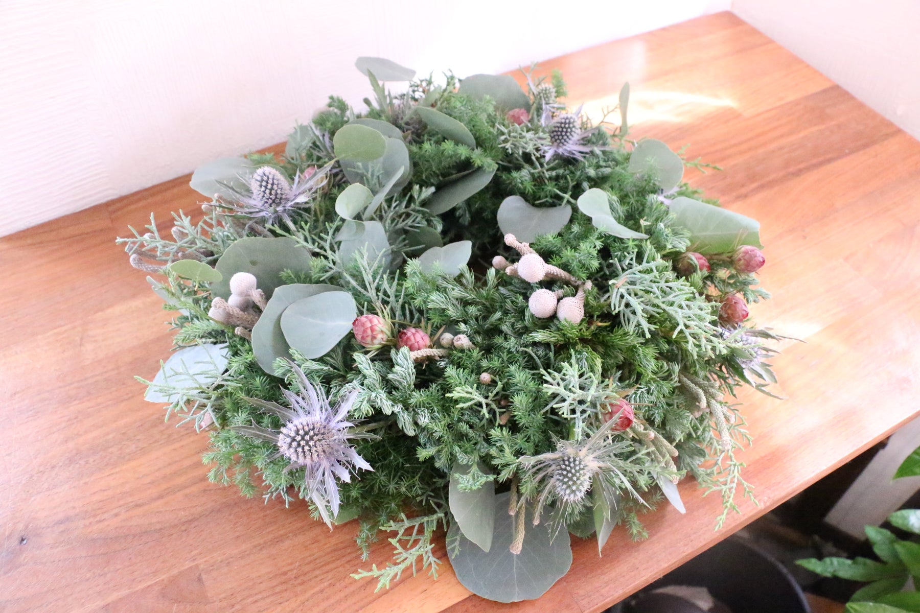 ヒムロスギやブルーアイスなどの針葉樹をベースに、ドライフラワーになる花材を丁寧に束ねて仕上げた、生花ならではの瑞々しさと香りが楽しめるリースです。