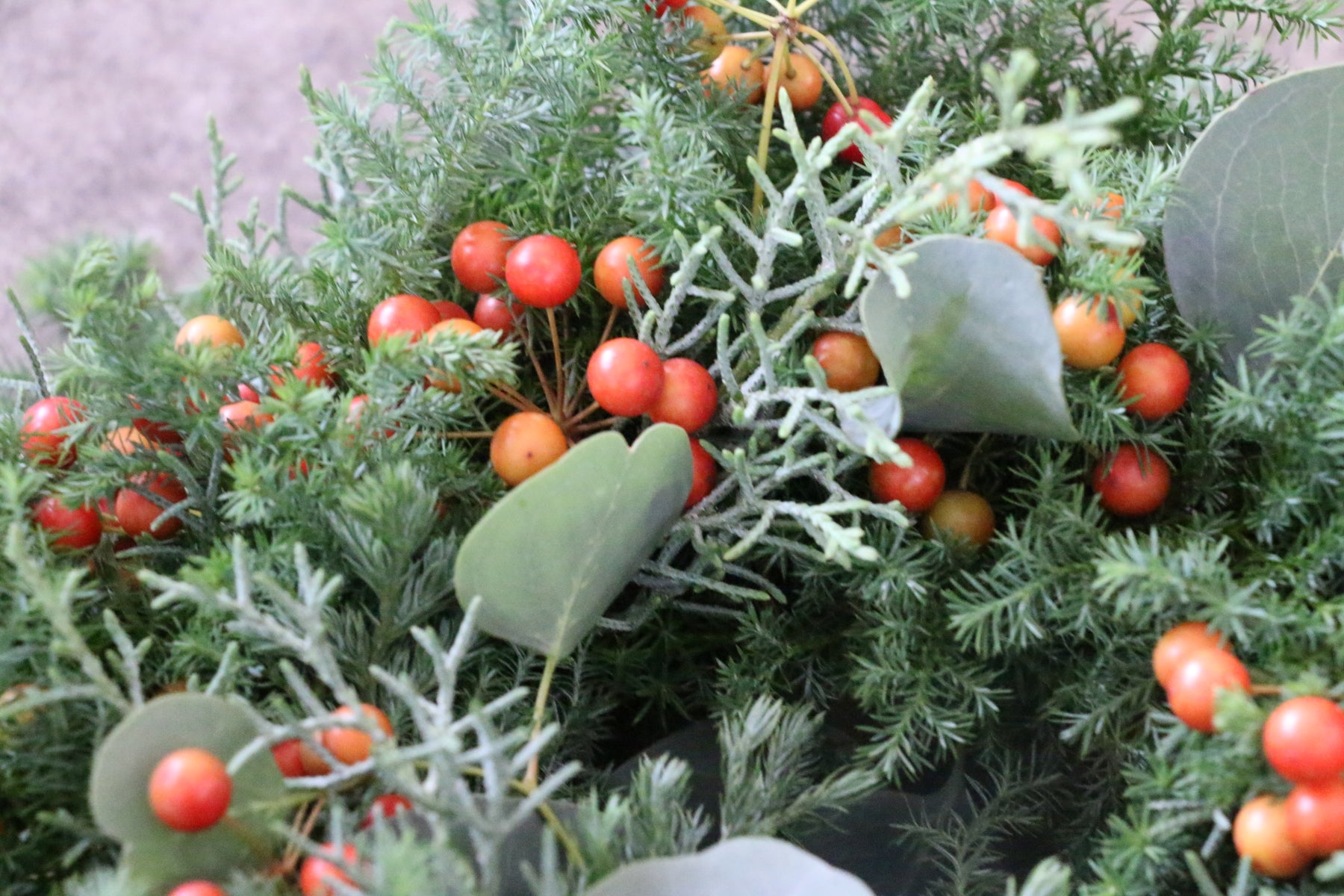 ヒムロスギやブルーアイスなどのグリーンに、真っ赤な実をあしらった、