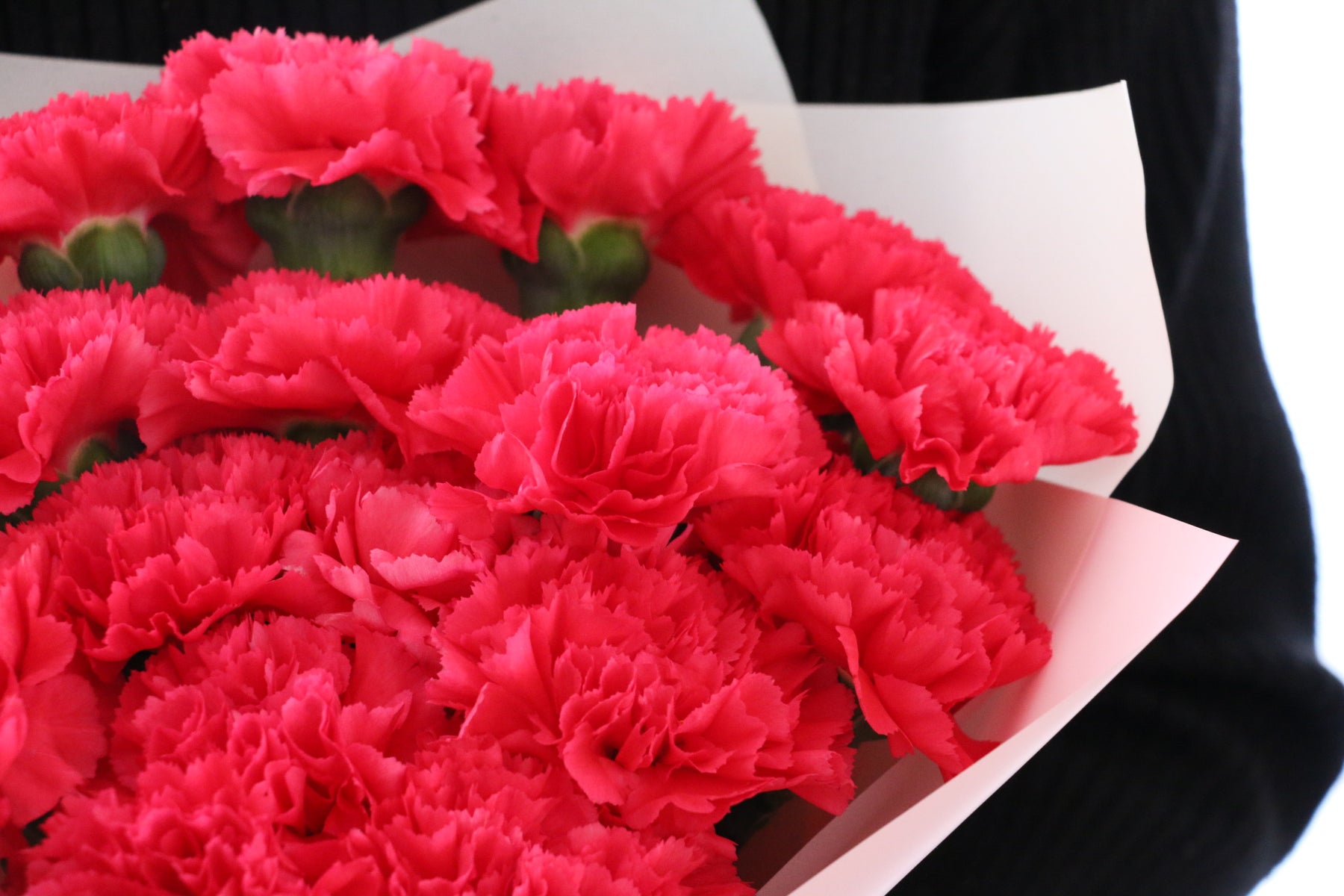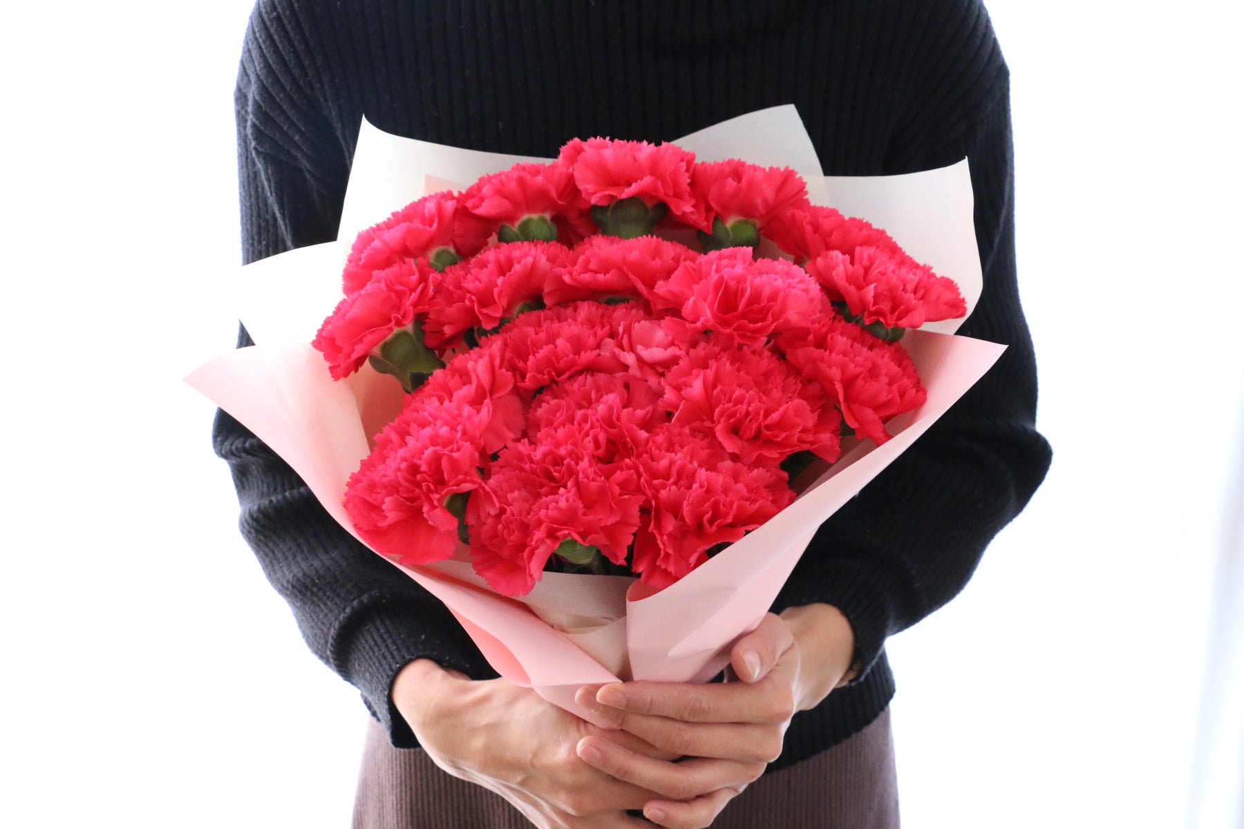 鮮やかで華やかな濃いピンクのカーネーションを20本束ねた、存在感のある花束です。