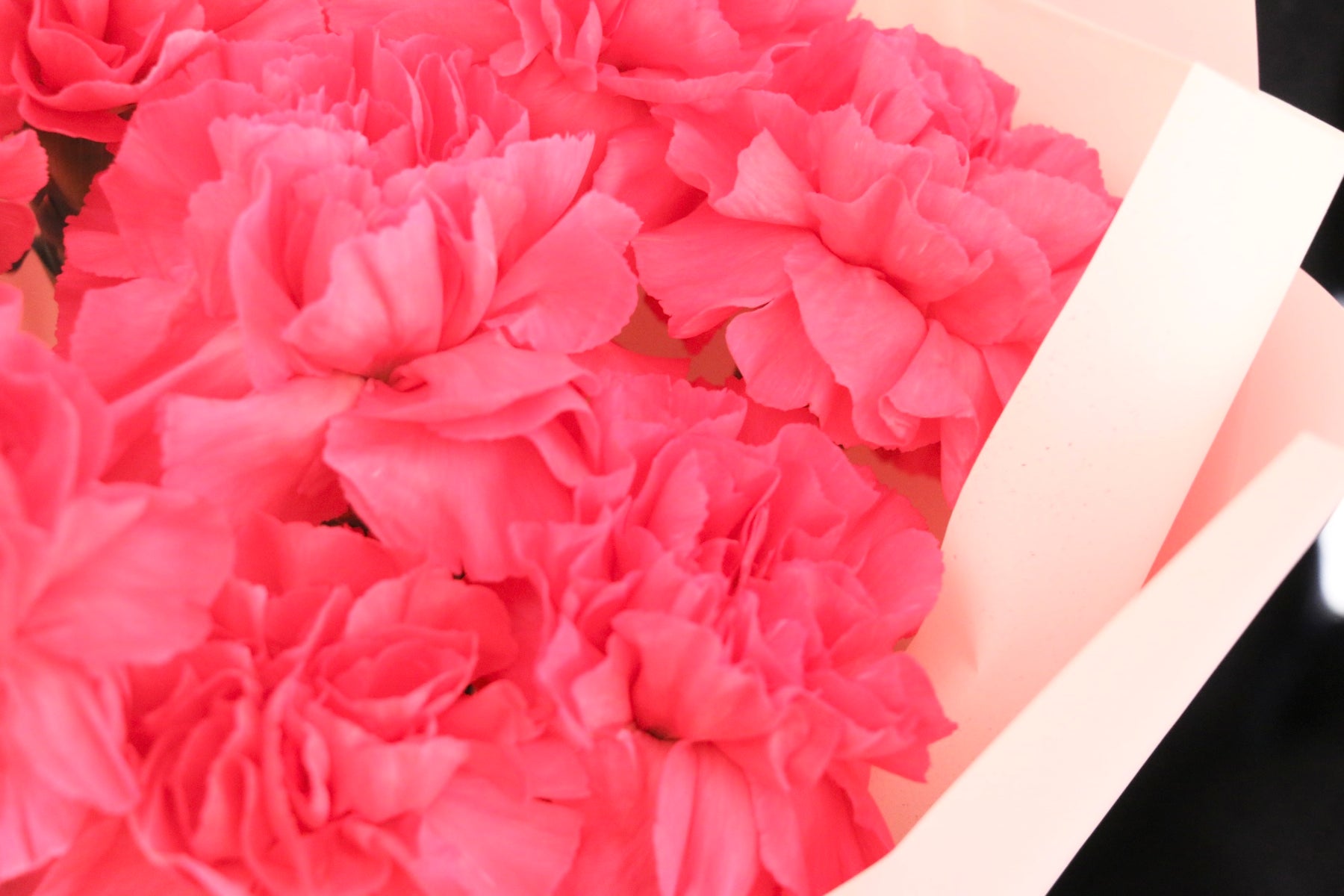 鮮やかで華やかな濃いピンクのカーネーションを束ねた、存在感のある花束です。