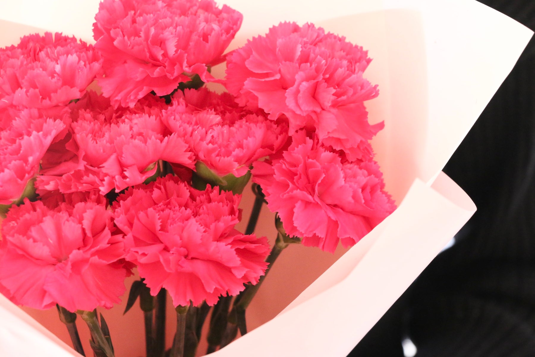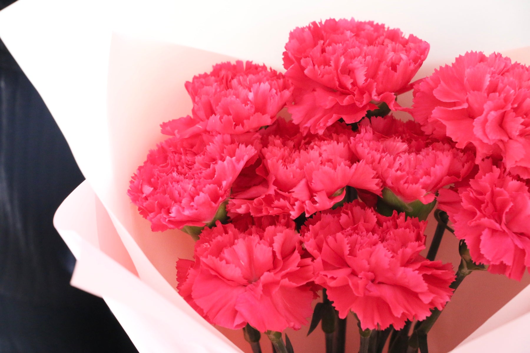鮮やかで華やかな濃いピンクのカーネーションを束ねた、存在感のある花束です。
