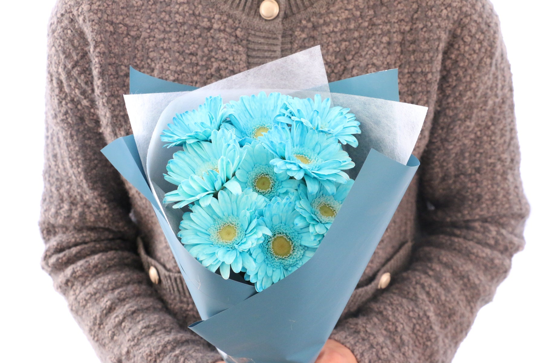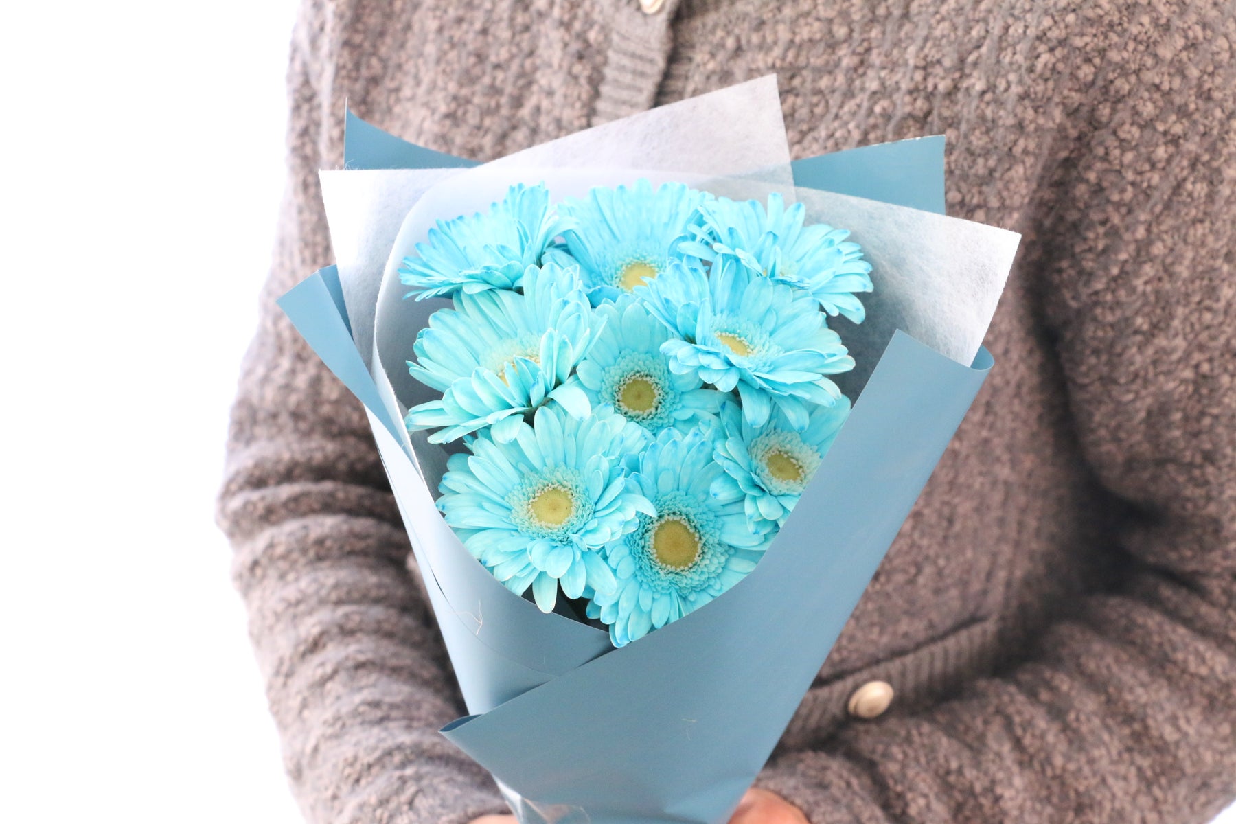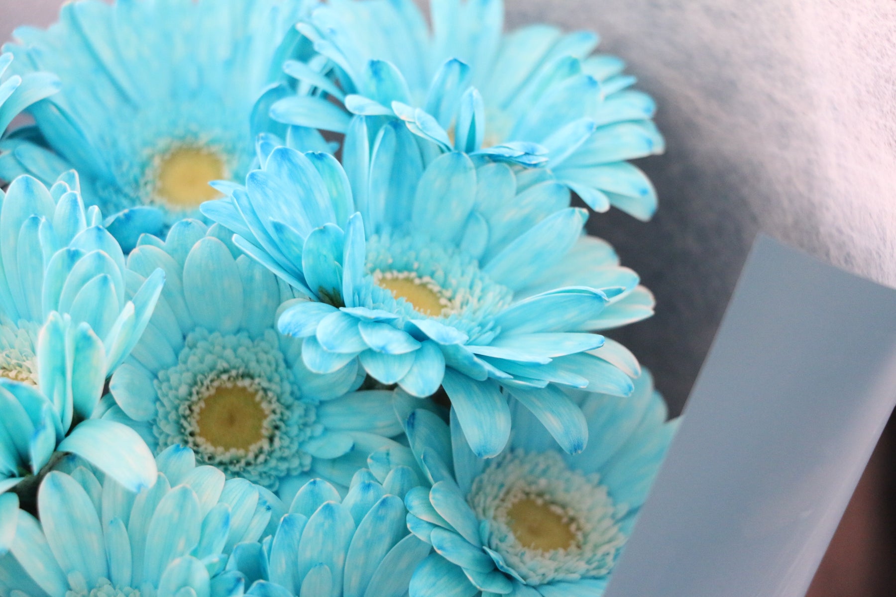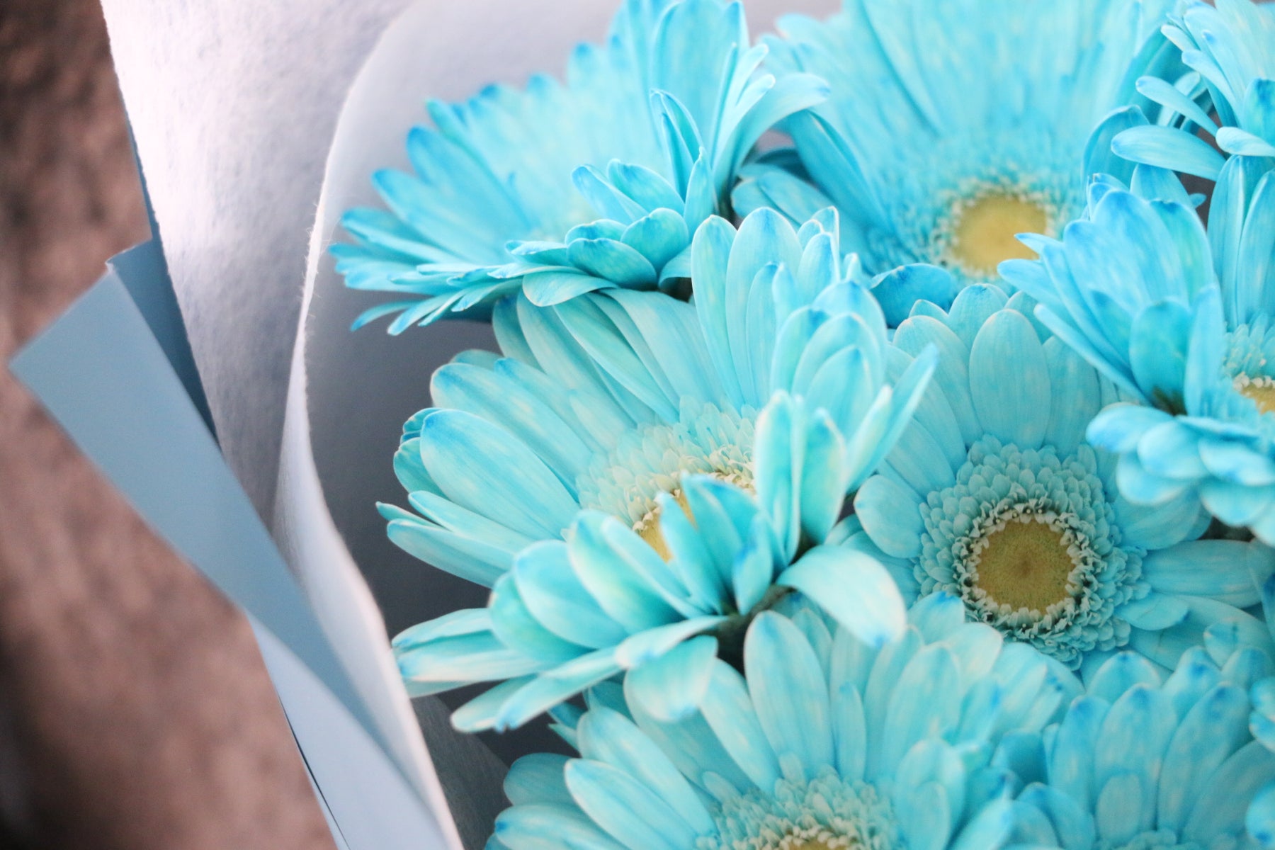 9本の水色(染め)のガーベラを束ねた花束です。水色のガーベラは自然には存在せず、人工的に染めています。ガーベラはパッと花弁が開き、明るい印象を与えてくれて、幅広い世代に人気のあるお花です。
