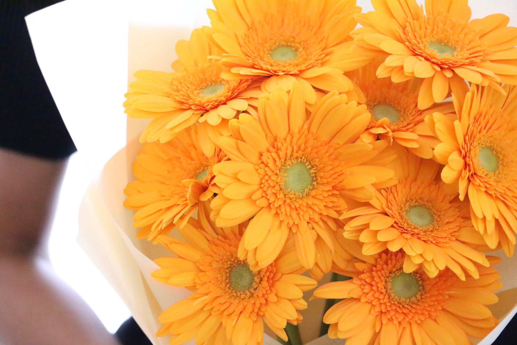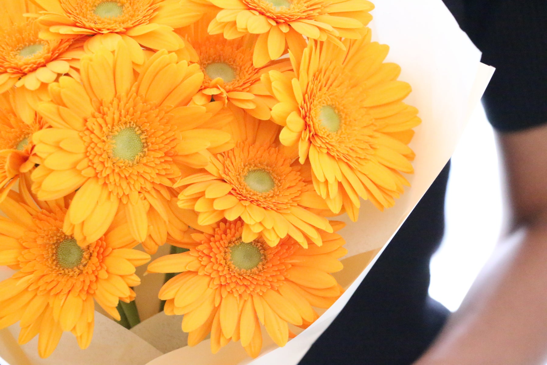 10本のオレンジ色のガーベラを束ねた花束です。ガーベラはパッと花弁が開き、明るい印象を与えてくれて、幅広い世代に人気のあるお花です。