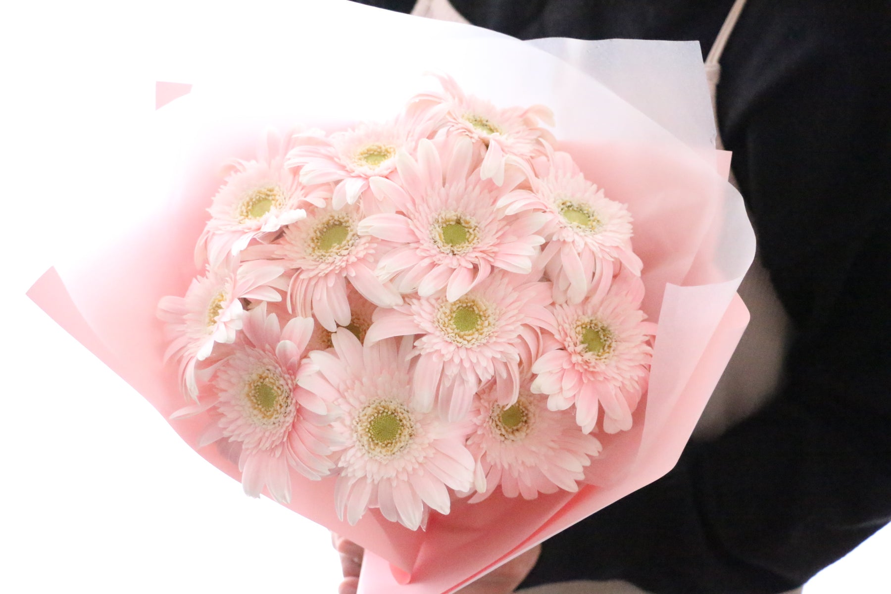 13本のピンク色のガーベラを束ねた花束です。ガーベラはパッと花弁が開き、明るい印象を与えてくれて、幅広い世代に人気のあるお花です。