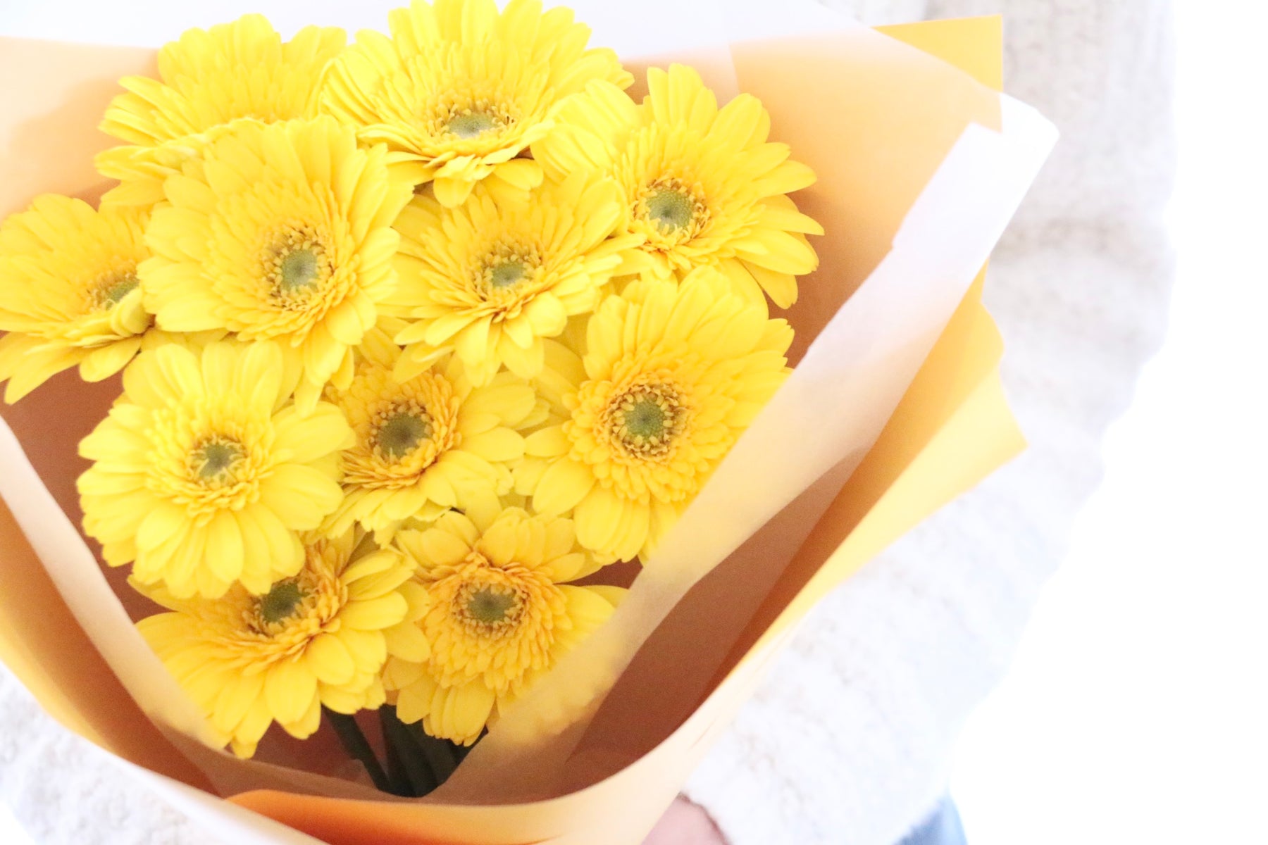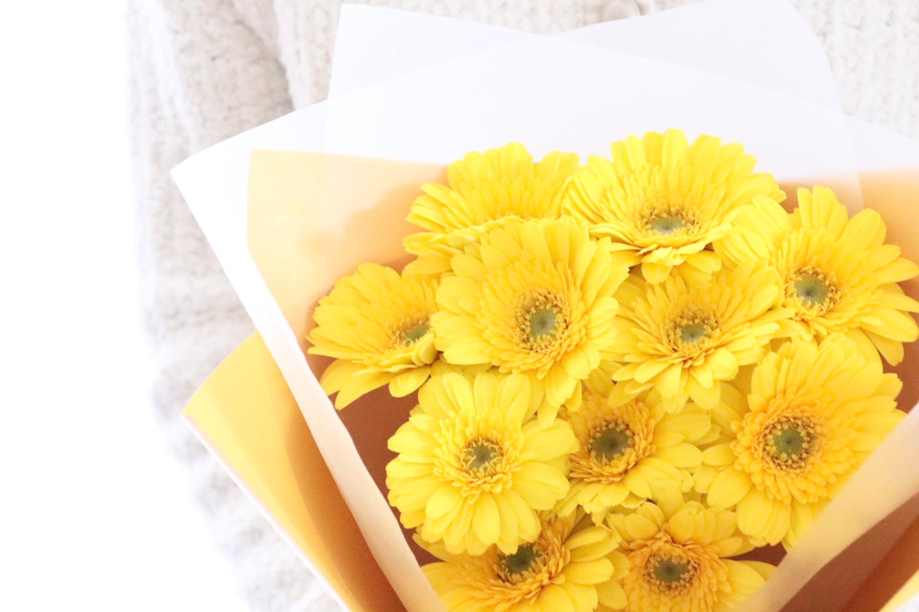 11本の黄色のガーベラを束ねた花束です。ガーベラはパッと花弁が開き、明るい印象を与えてくれて、幅広い世代に人気のあるお花です。