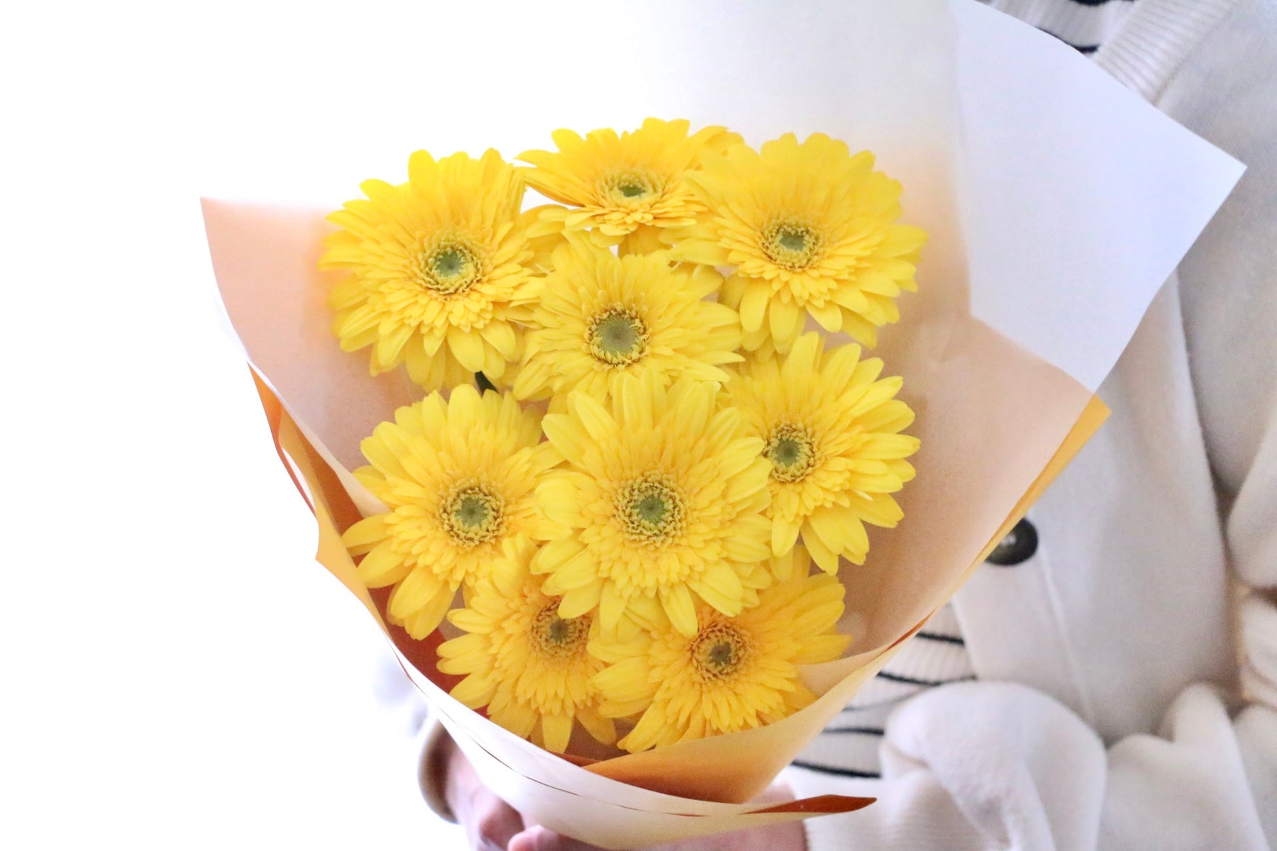 9本の黄色のガーベラを束ねた花束です。ガーベラはパッと花弁が開き、明るい印象を与えてくれて、幅広い世代に人気のあるお花です。