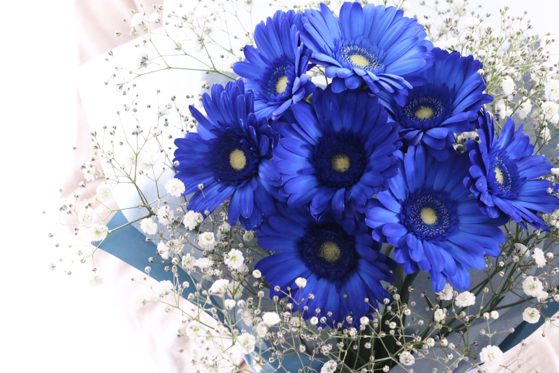 立派なボリュームのカスミソウの中に青色のガーベラを8本お入れした花束です。ガーベラはまばらに配置し、それぞれのガーベラを取り巻くようにカスミソウを散りばめたスタイルでお届け致します。