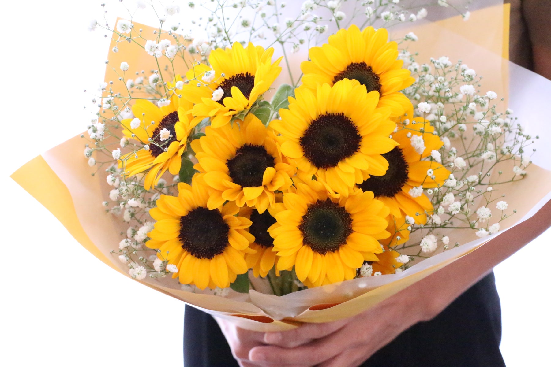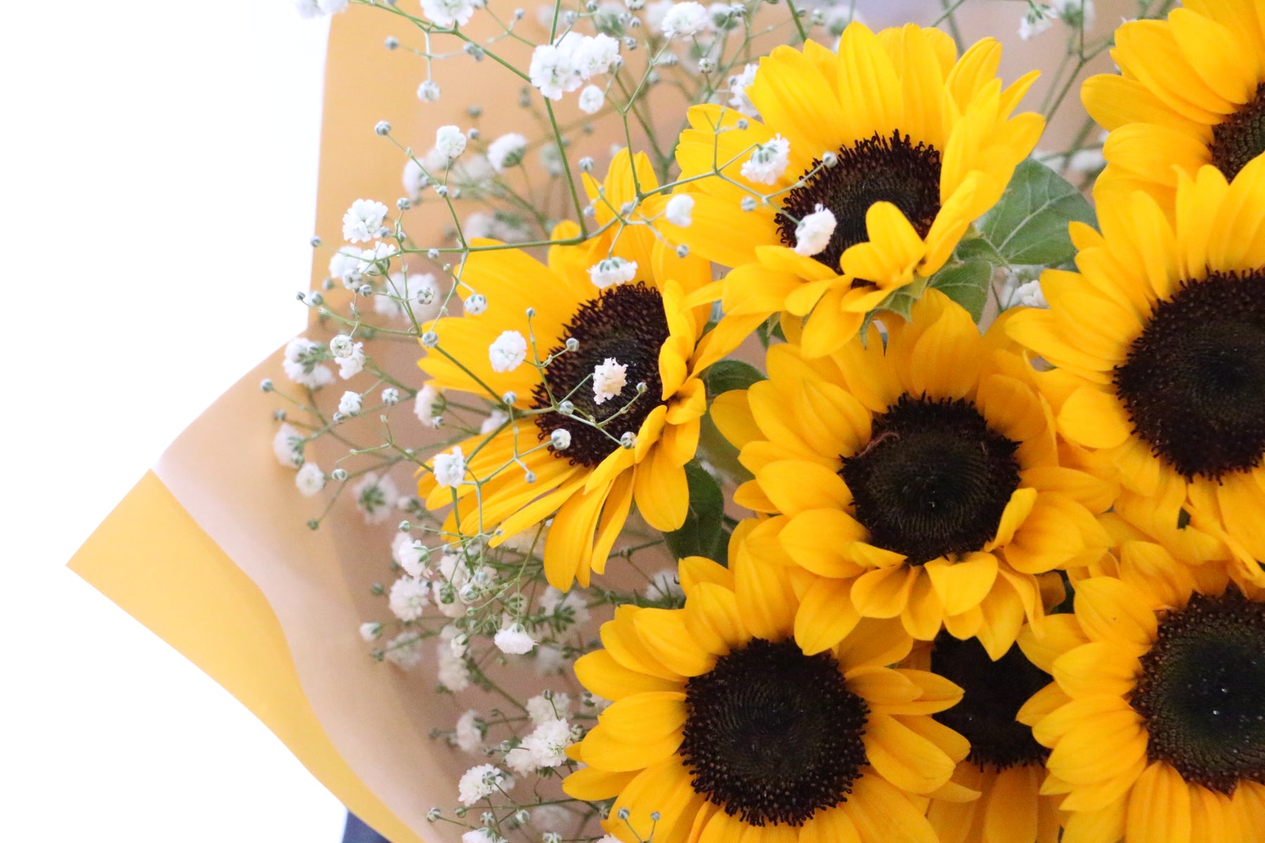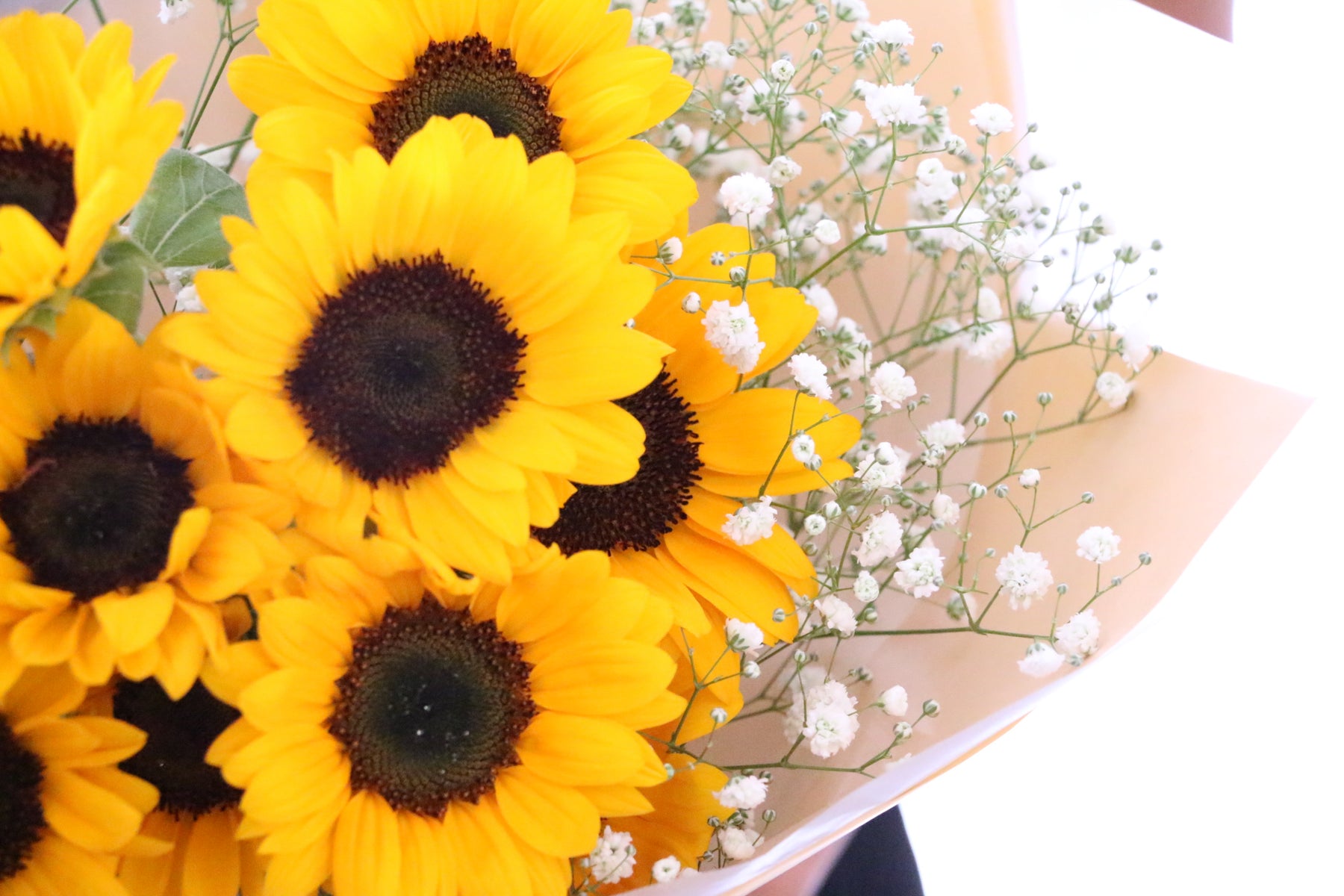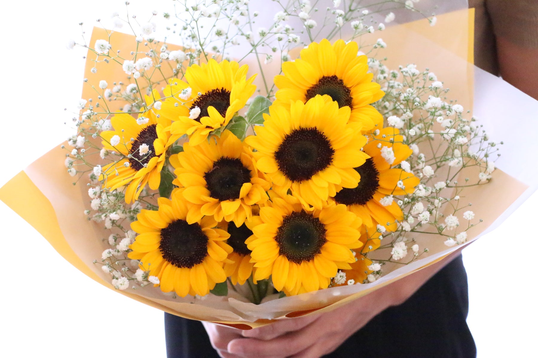 鮮やかなオレンジ色のひまわり10本とカスミソウを束ねたシンプルな花束です。見ているだけで元気をもらえるようなひまわり。そんな夏を代表するお花であるひまわりをお楽しみいただける花束で、お誕生日や退職祝い、ちょっとしたお礼などあらゆる場面でお選びいただけます。