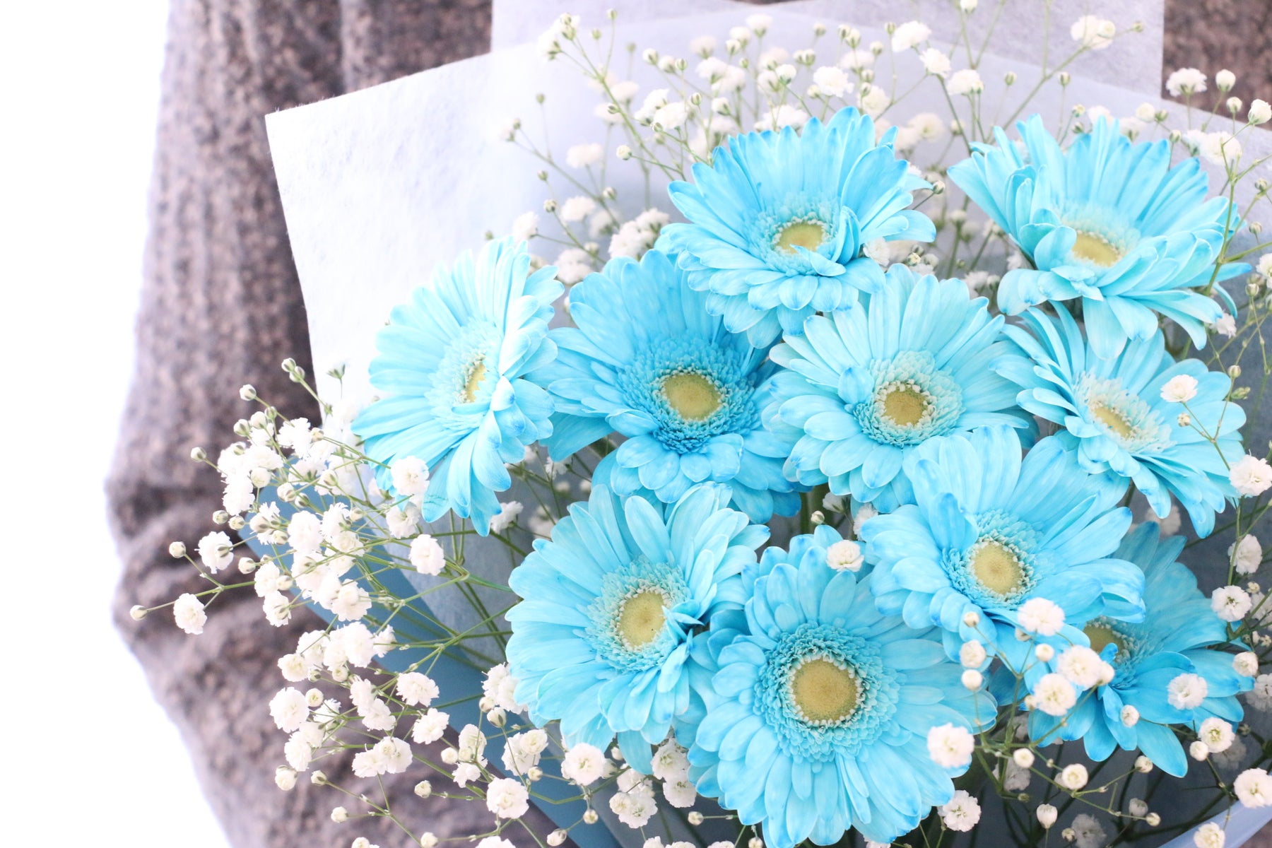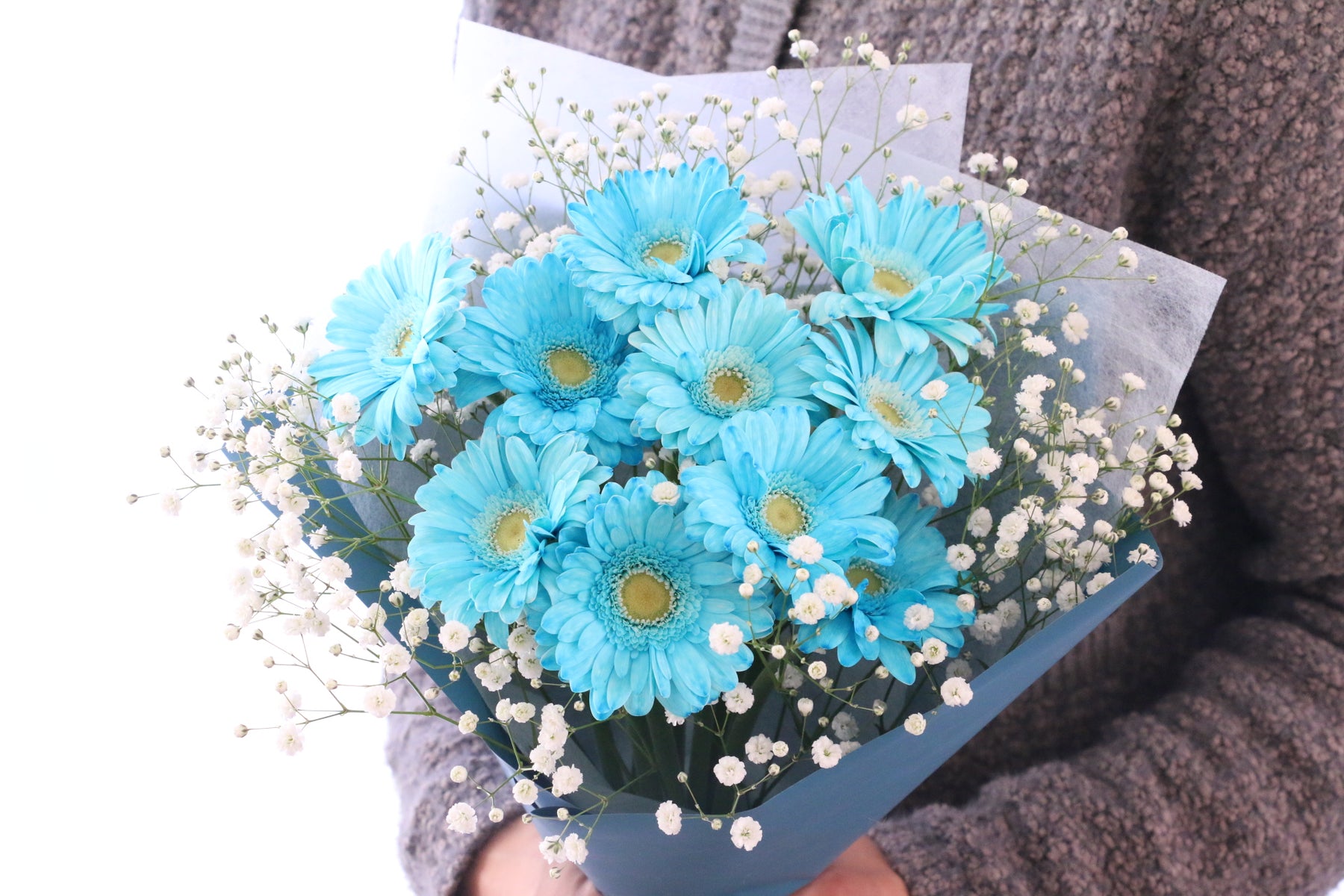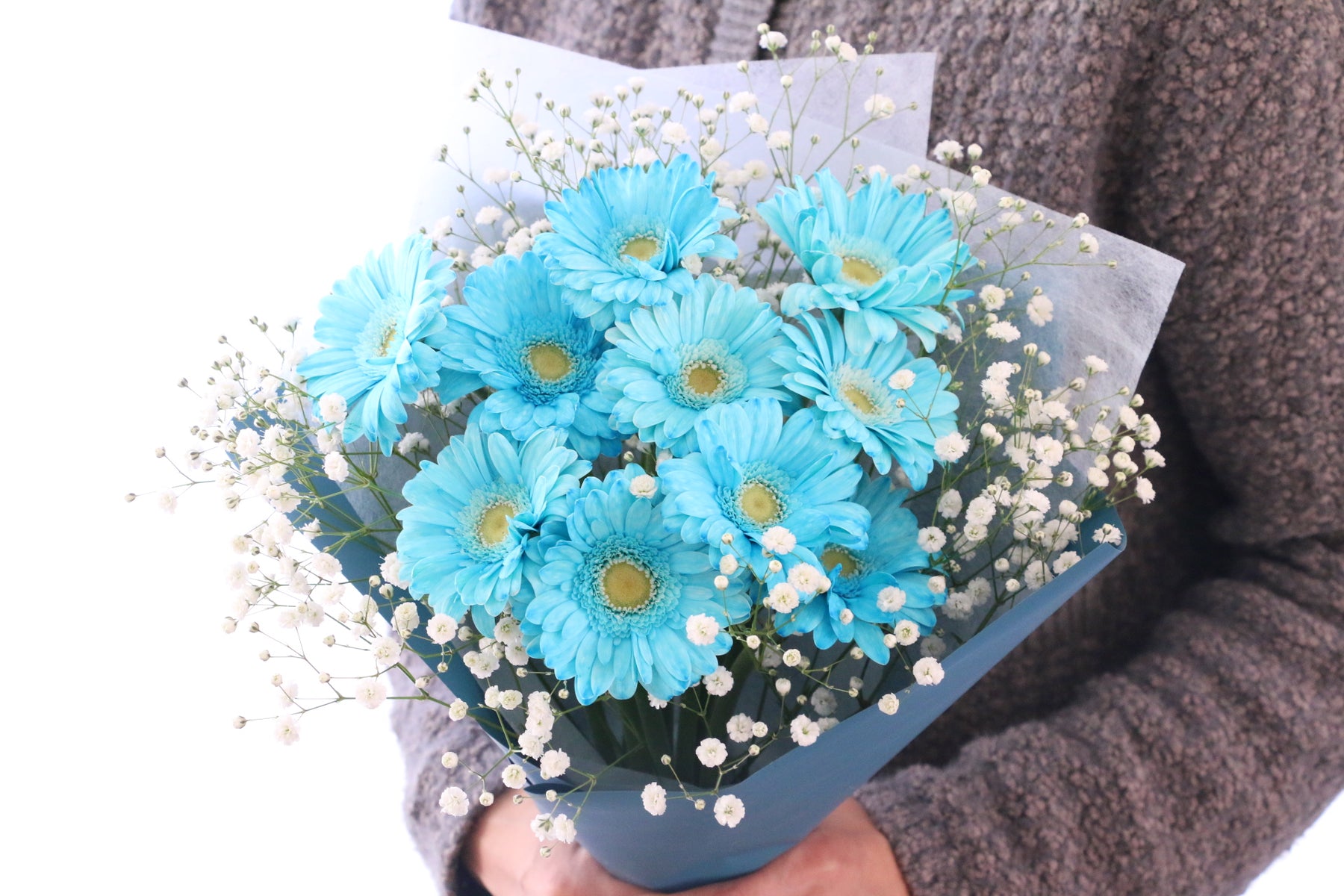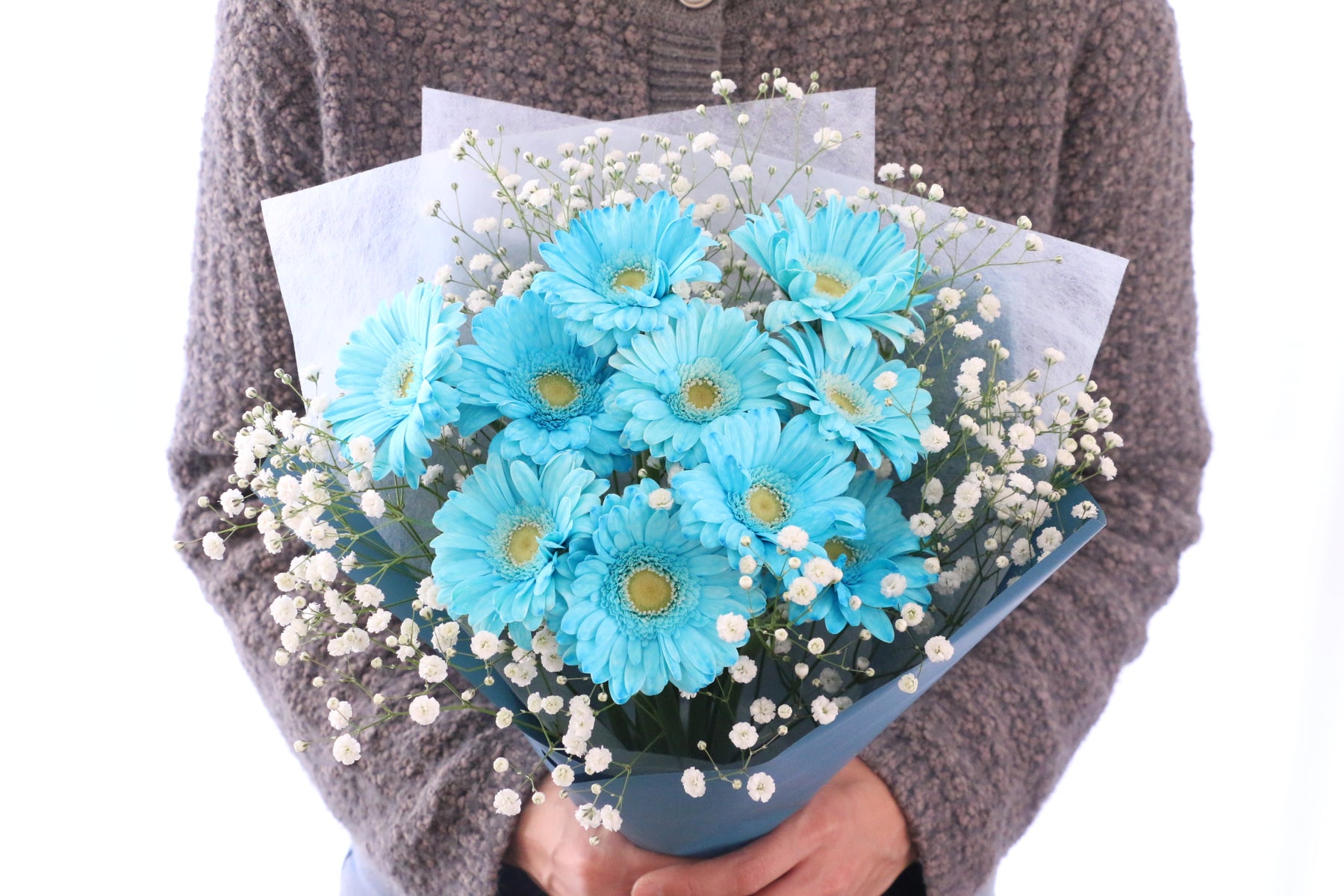 10本の水色(染め)のガーベラをカスミソウがふんわりと包み込むように束ねた花束です。水色のガーベラは自然には存在せず、人工的に染めています。ガーベラはパッと花弁が開き、明るい印象を与えてくれて、幅広い世代に人気のあるお花です。