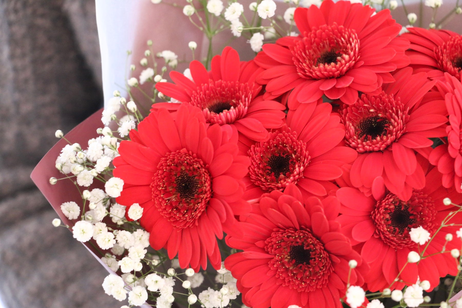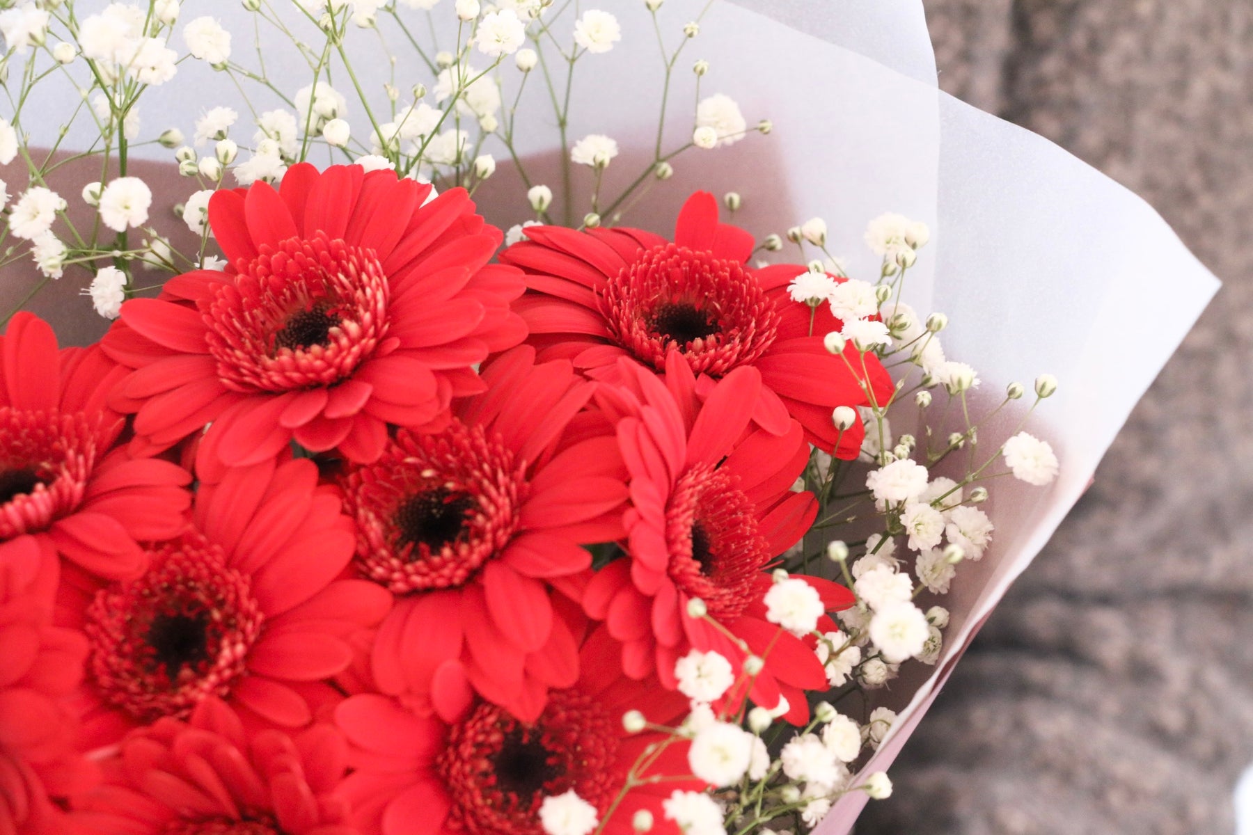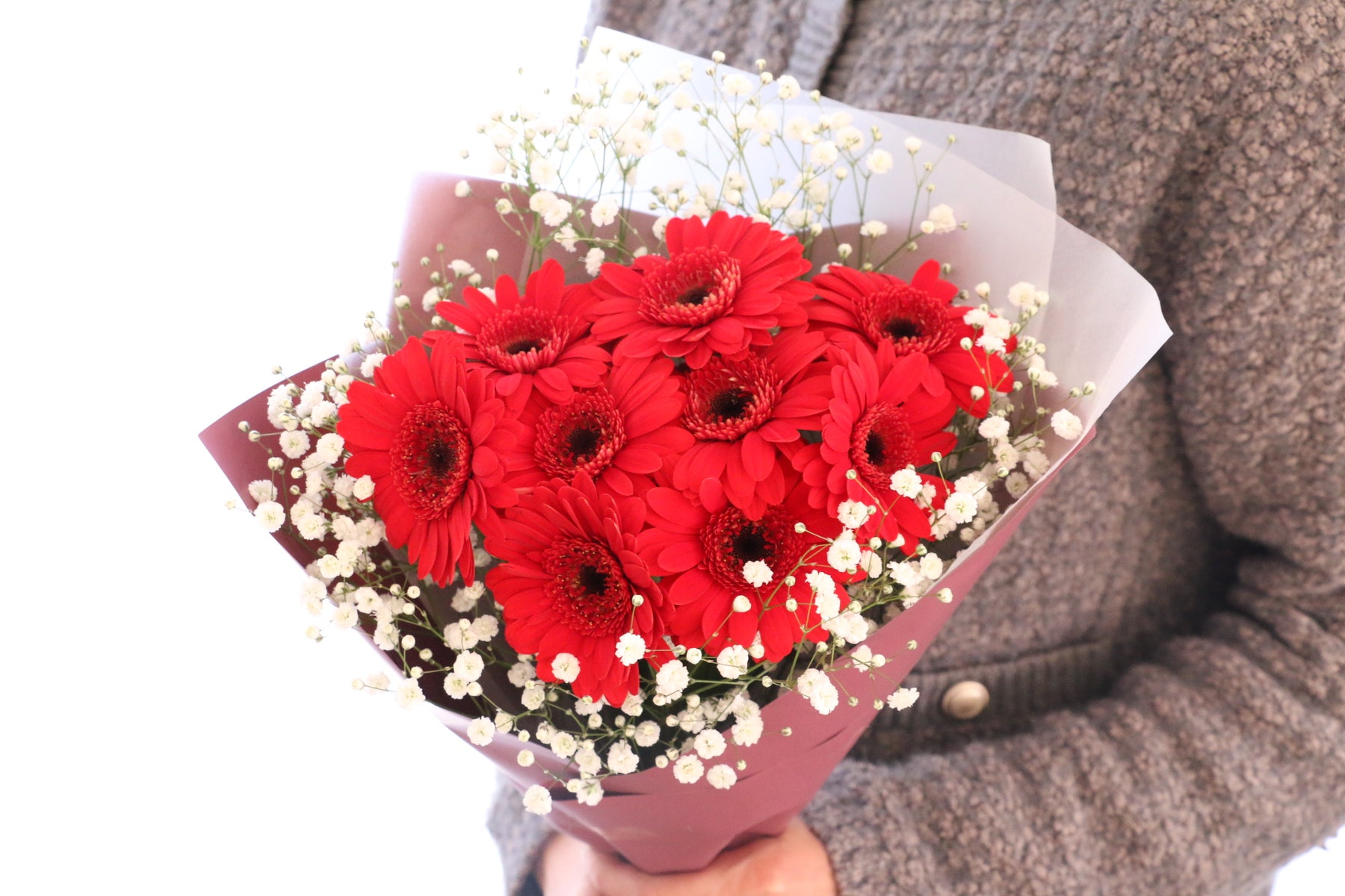 9本の赤色のガーベラの周りをふんわりとカスミソウで包み込むように束ねた花束です。ガーベラはパッと花弁が開き、明るい印象を与えてくれて、幅広い世代に人気のあるお花です。