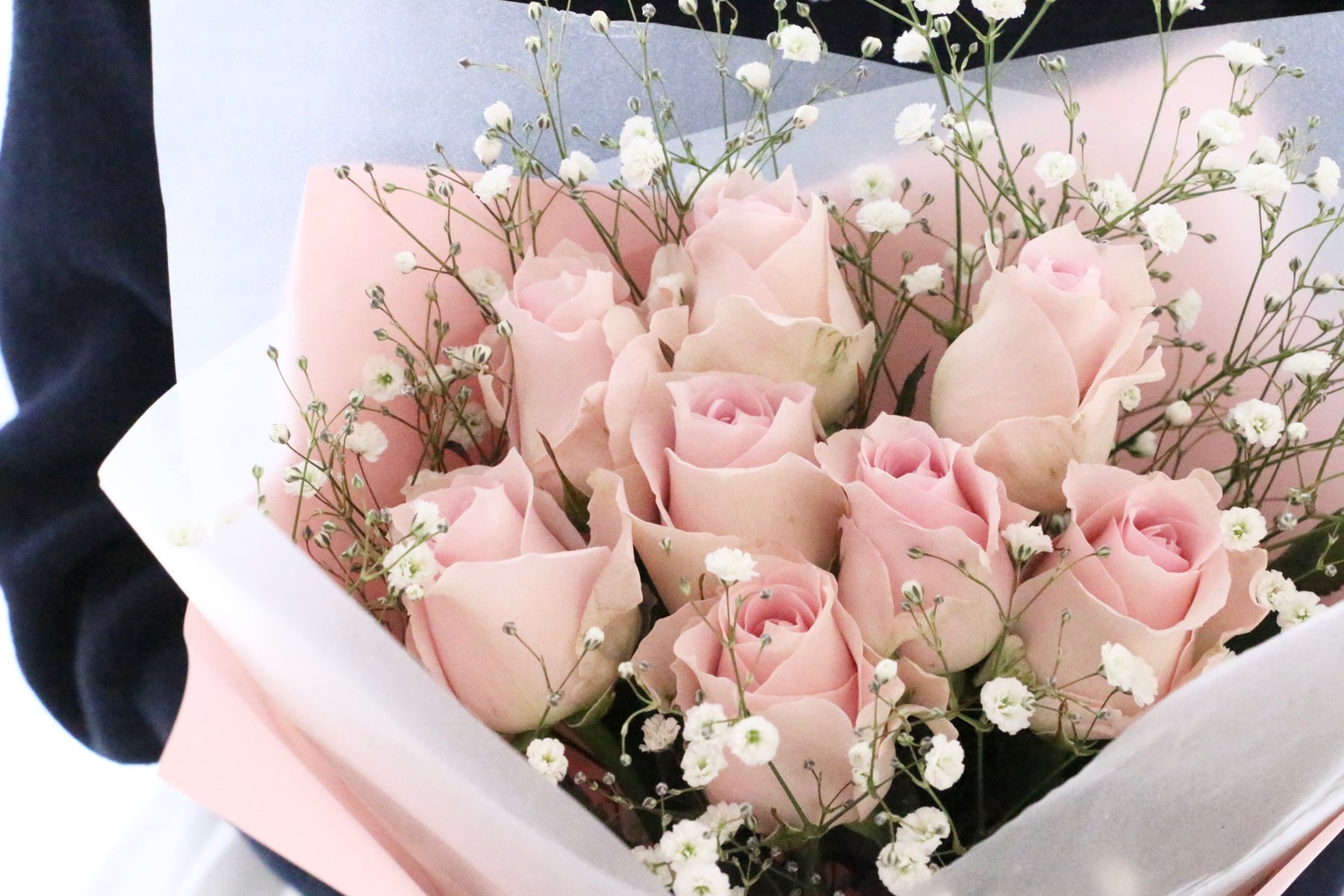 プロポーズの花束では赤いバラを連想される方も多いですが、ピンク色のバラは赤いバラよりも柔らかく優しい雰囲気を演出することができ、ピンク色のバラ自体には「感謝」という花言葉もあります。