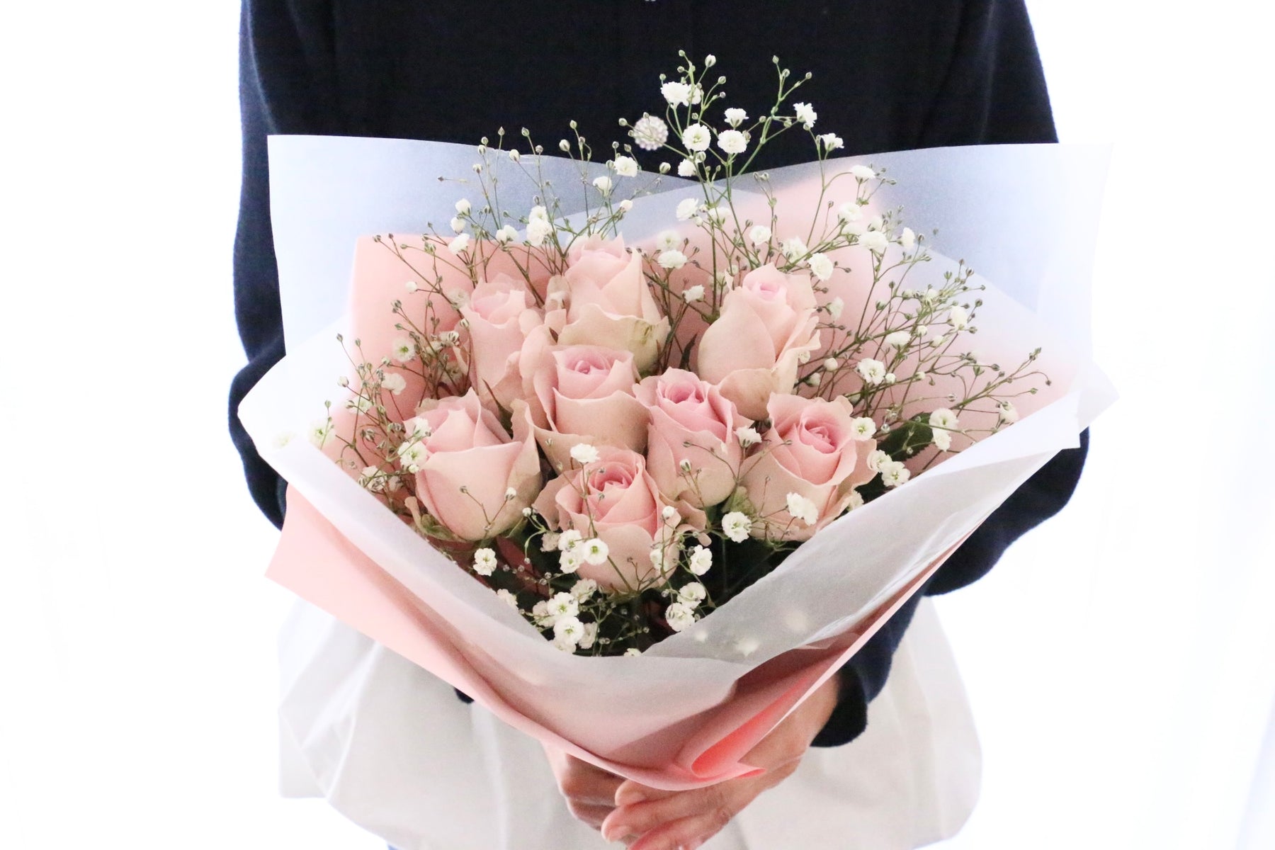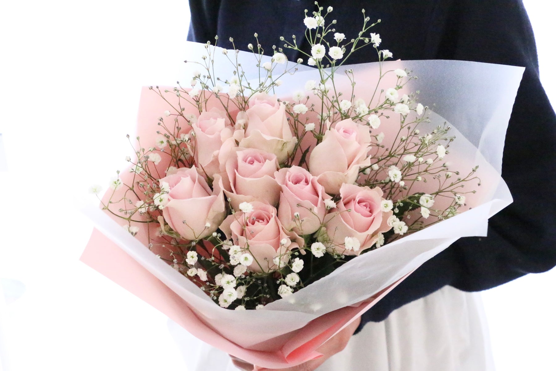 本商品はピンク色のバラの周りをふんわりとカスミソウで囲った花束です。バラのみの花束よりもボリュームがよく、華やかな見た目になります。使用するバラの品種はご注文時期により変更となる場合が可能性がございますので、あらかじめご了承ください。