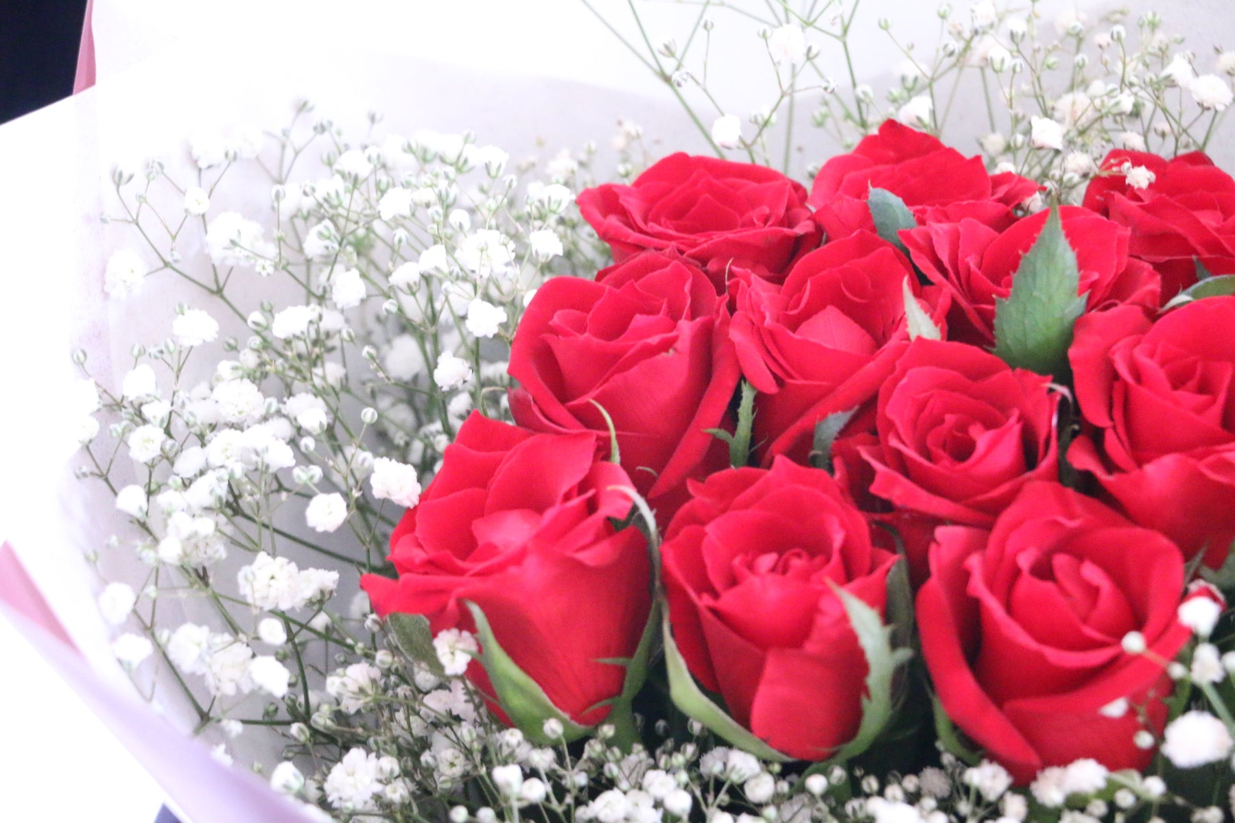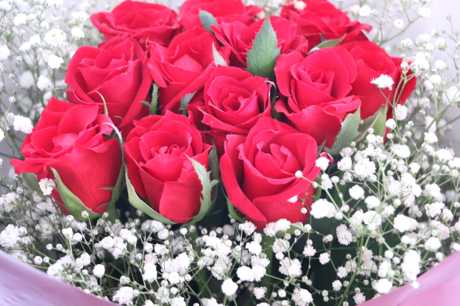 A. 12本のバラの花束(ダズンローズ)は「私の妻になってください」という意味を持ちます。これにかすみ草が加わることで、永遠の愛や感謝の気持ちを伝えるのにぴったりの、よりロマンチックな花束となります。