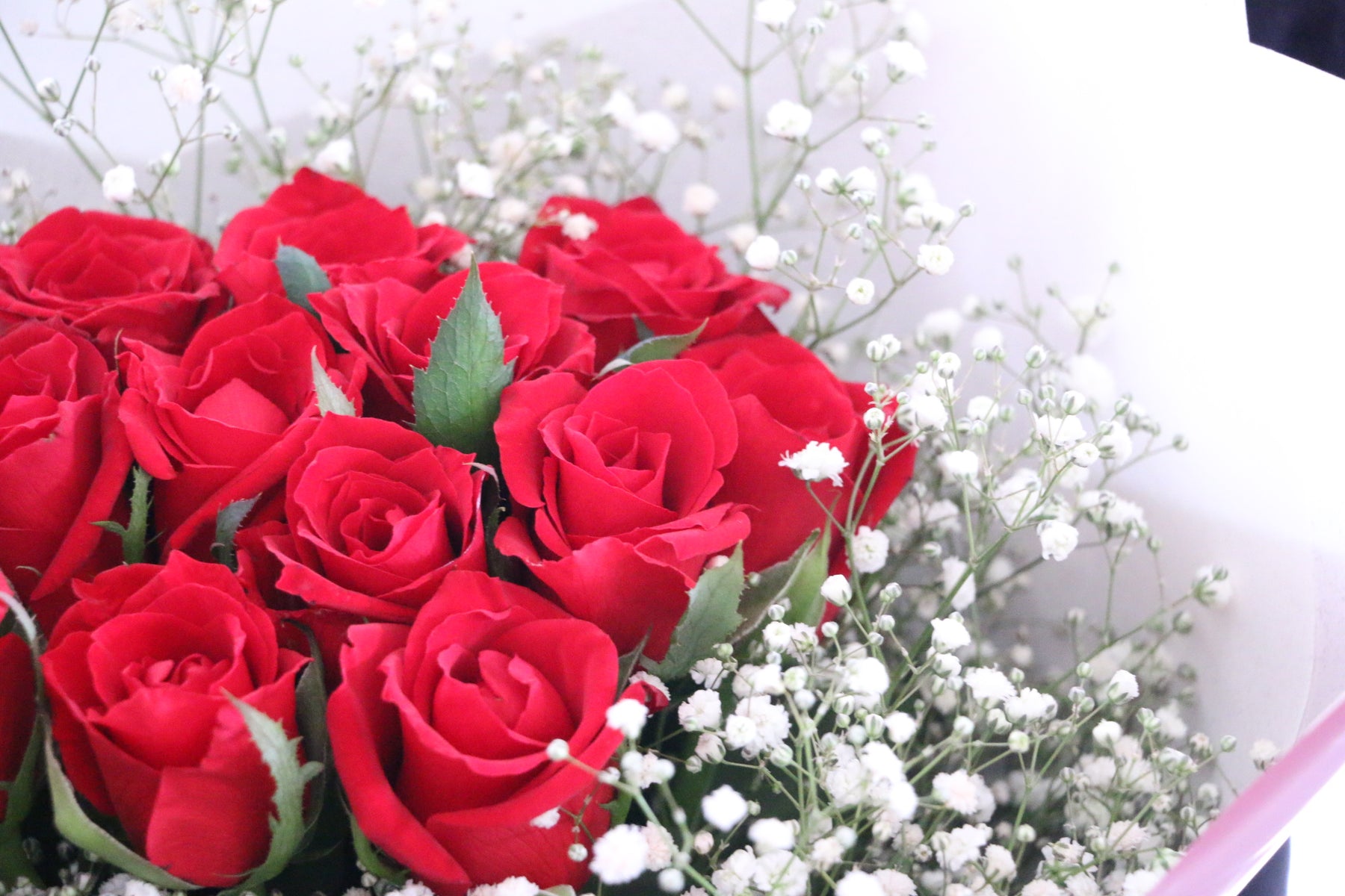 本商品は赤いバラに加えて相性の抜群のカスミソウ(1本)を加えた花束です。バラの周りをカスミソウで包み込むように束ねて神秘的な雰囲気を演出します。