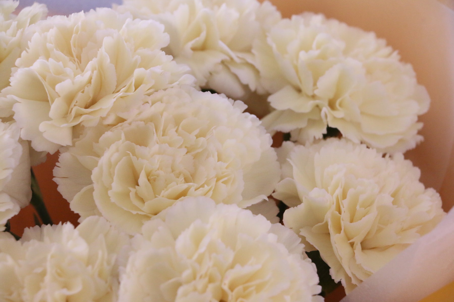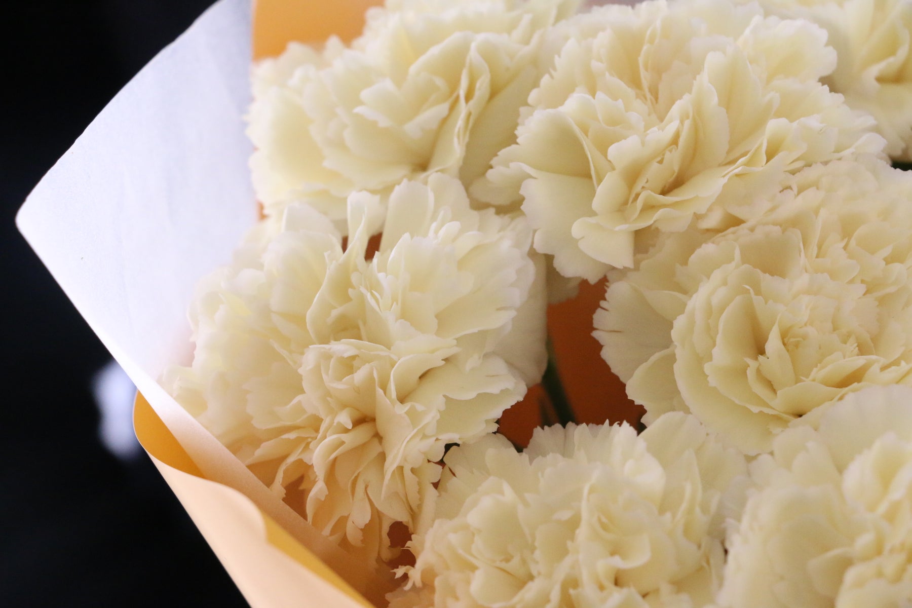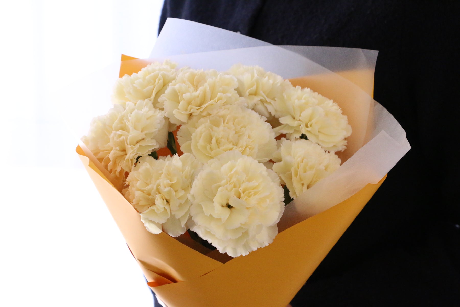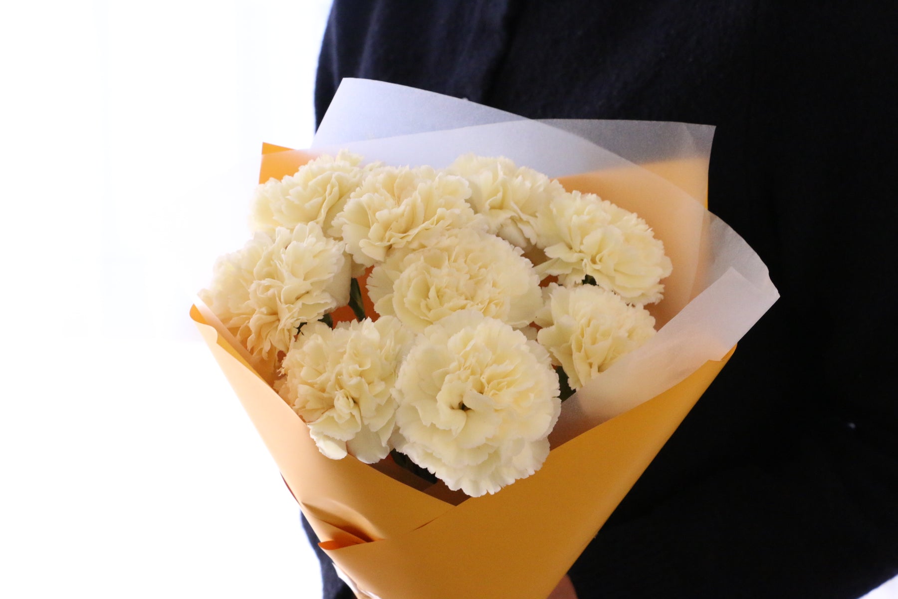 淡く優しい黄色がふんわりと広がる、上品で柔らかな印象のカーネーションの花束です。