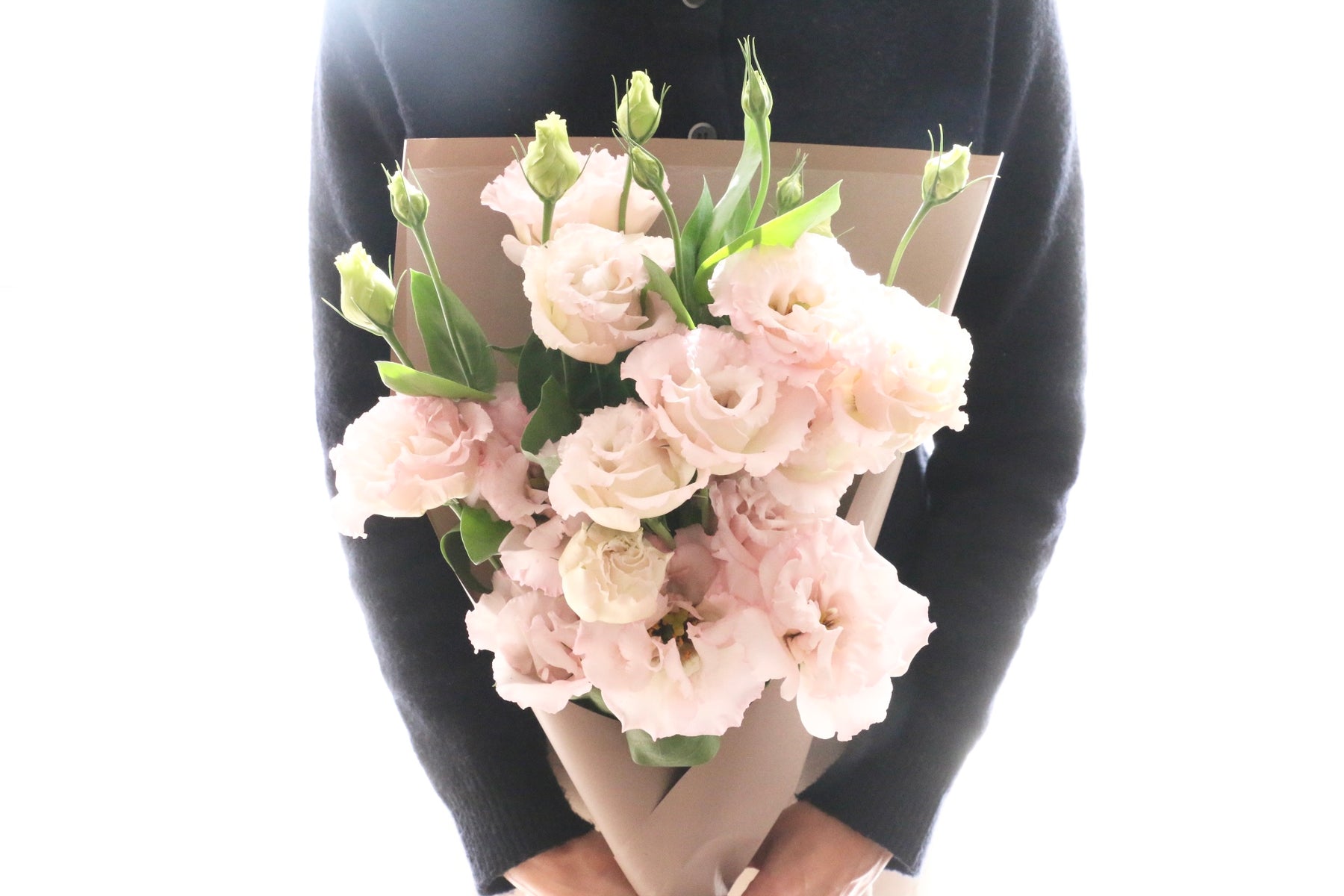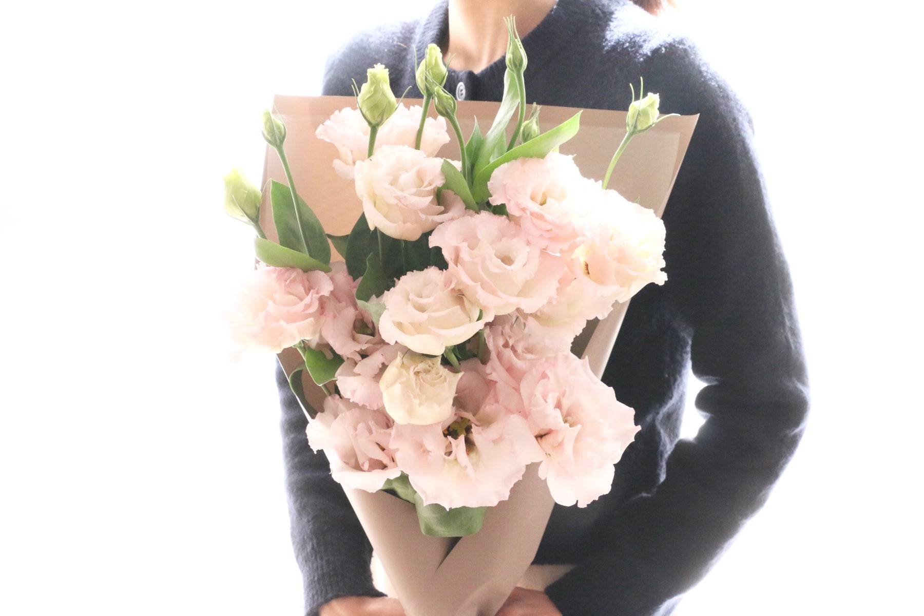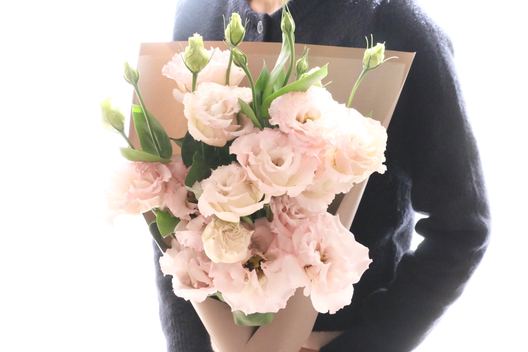柔らかな色合いが美しい、ピンクのトルコキキョウだけで束ねた上品な花束です。