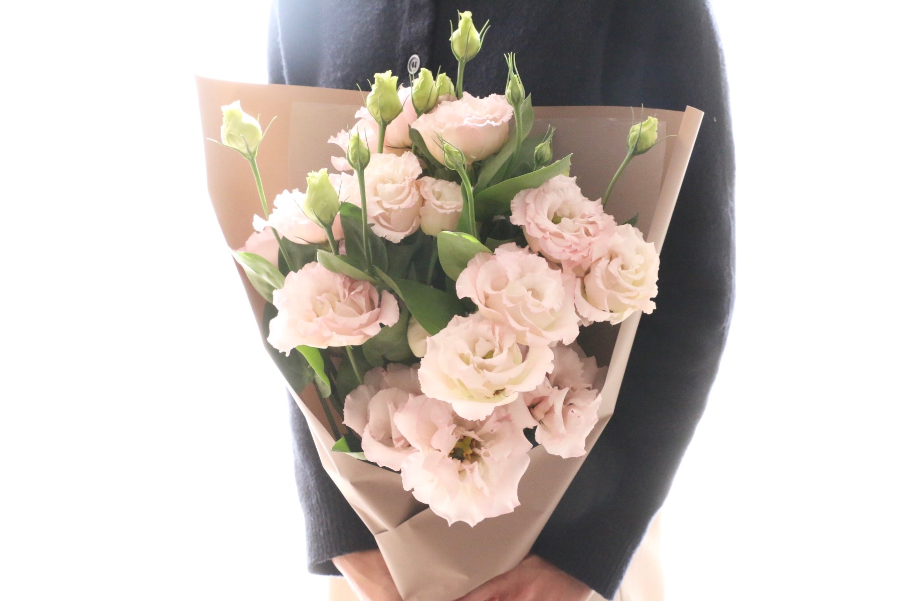 柔らかな色合いが美しい、ピンクのトルコキキョウだけで束ねた上品な花束です。