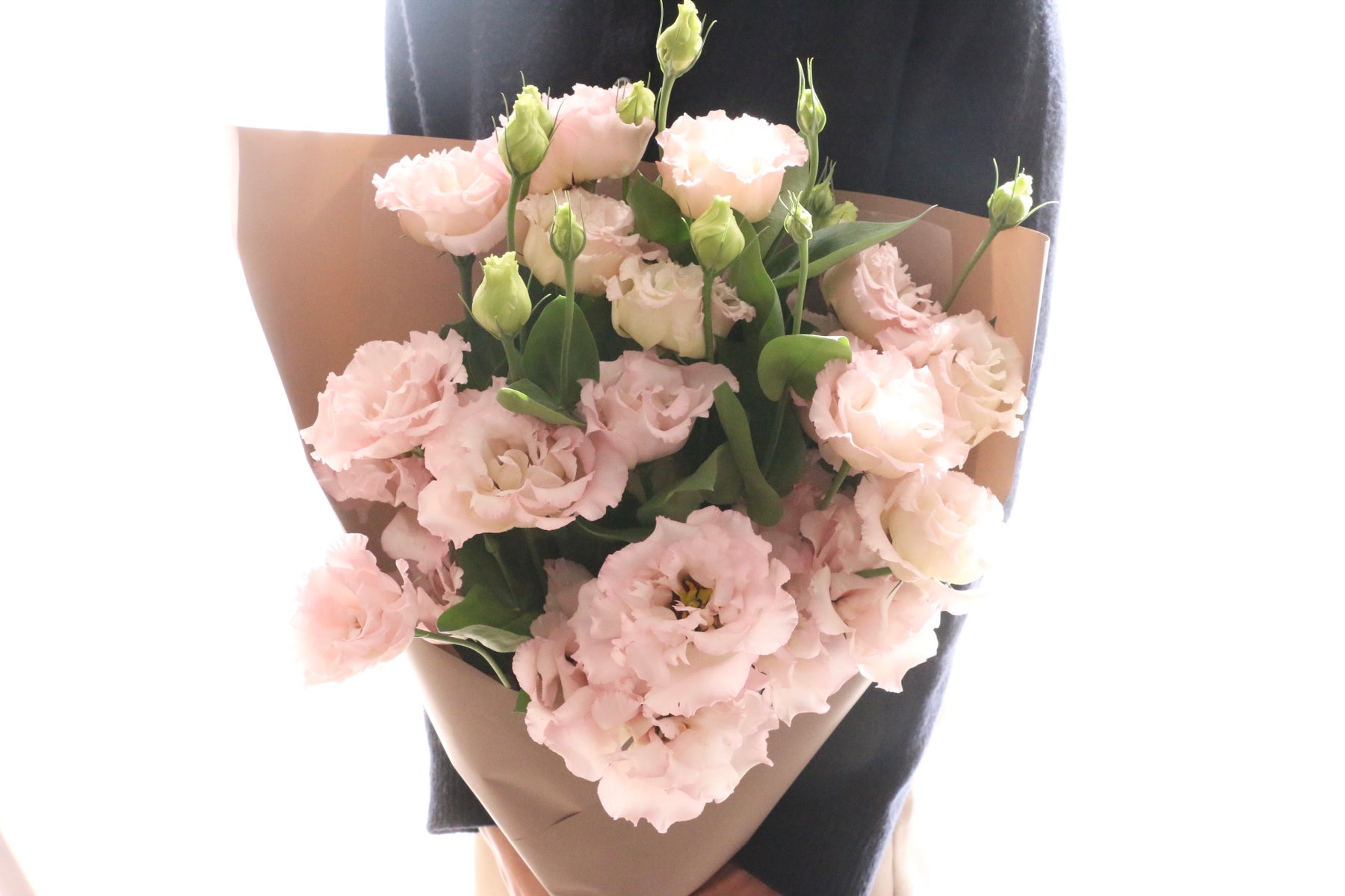 柔らかな色合いが美しい、ピンクのトルコキキョウだけで束ねた上品な花束です。