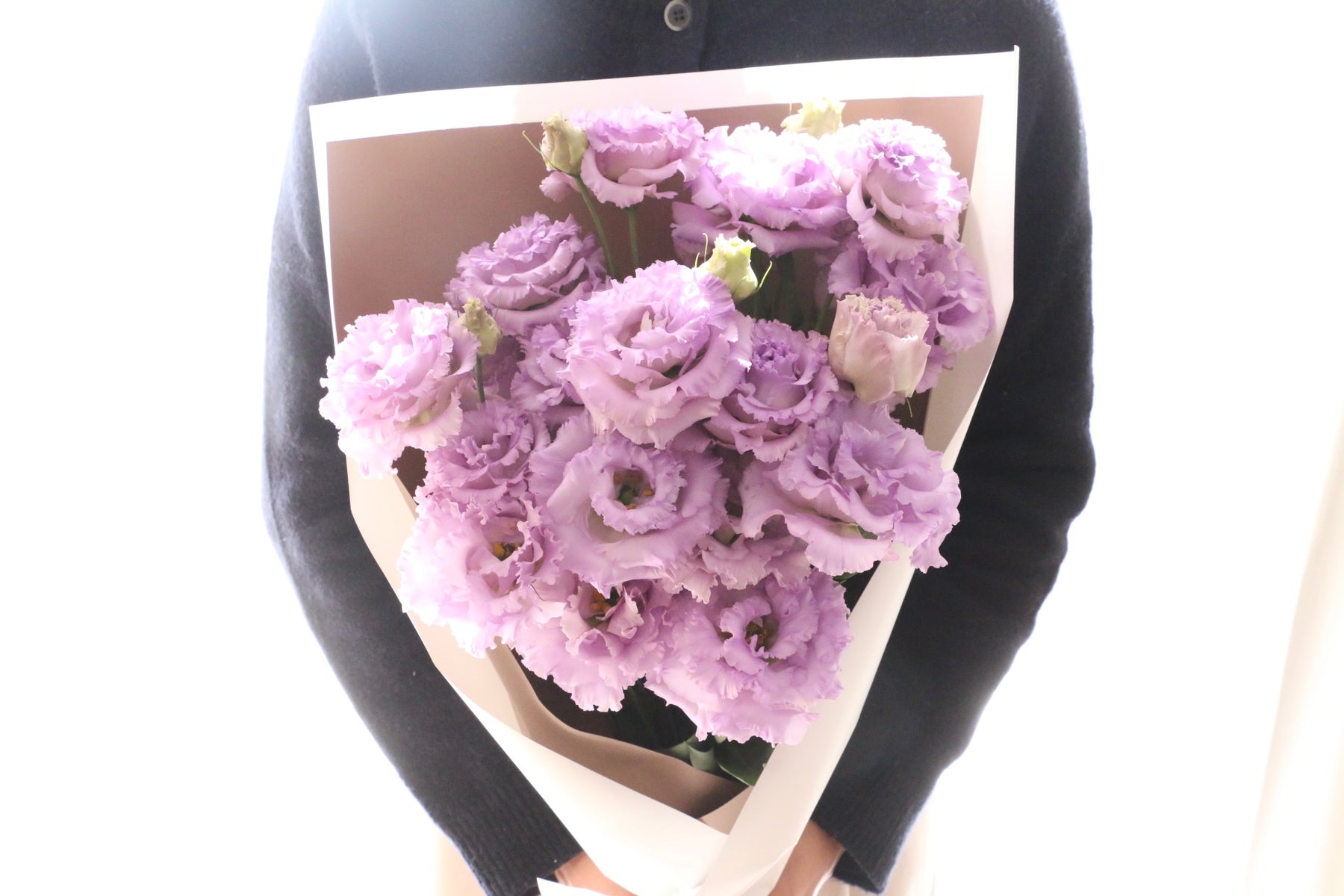 深みのある紫が美しく咲く、上品なトルコキキョウだけを束ねた花束です。