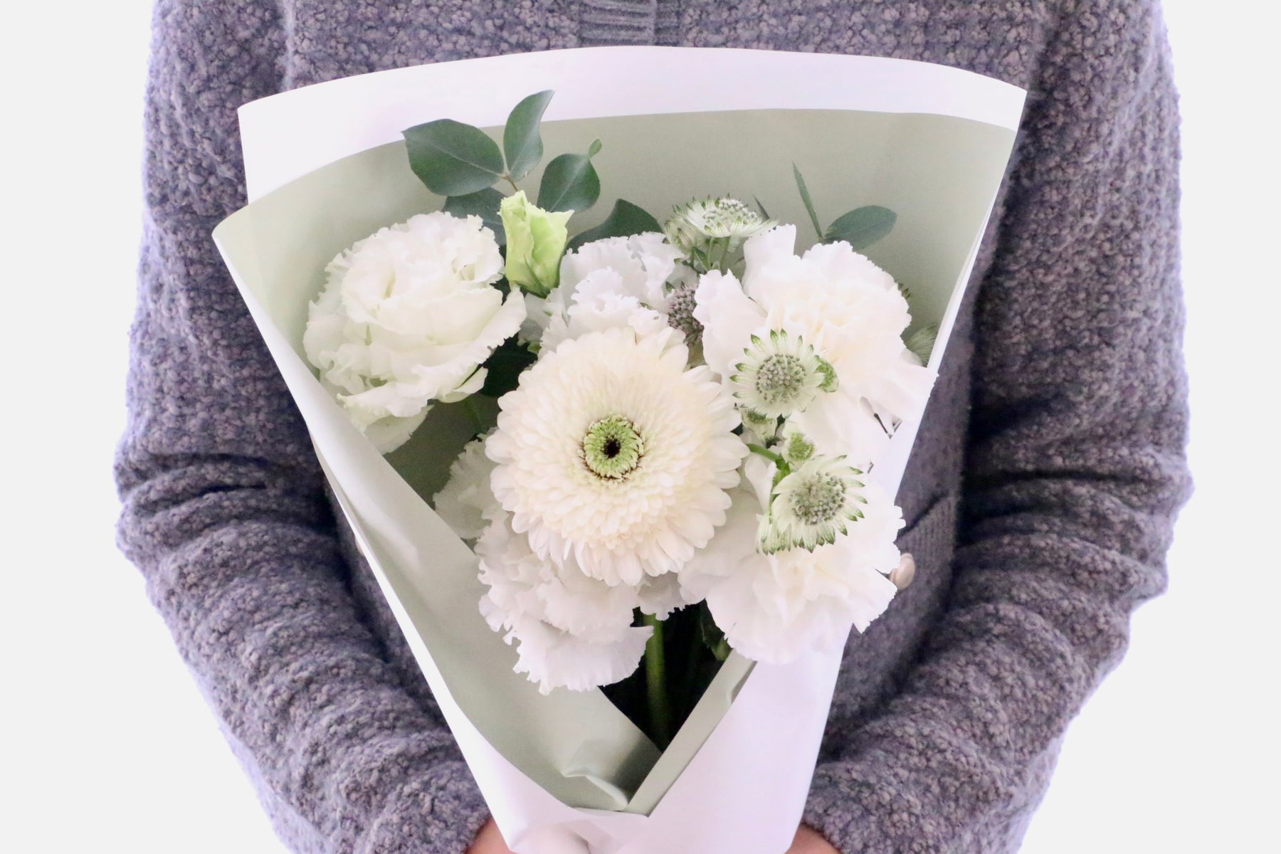 花束商品は無料にてラッピング致します。花束ラッピングは2種類のペーパー(内側:不織布、ワックスペーパー、ネット生地・外側:OPPラッピングペーパー)を使用して、上品に仕上げます。全体の雰囲気を決める外側のペーパーの色味は5種類からご自由にお選びいただけます。ご希望の色味を上部のオプション選択よりお選びください。内側のペーパーについては花束の雰囲気や季節に合わせて、最適なものをお選び致します。